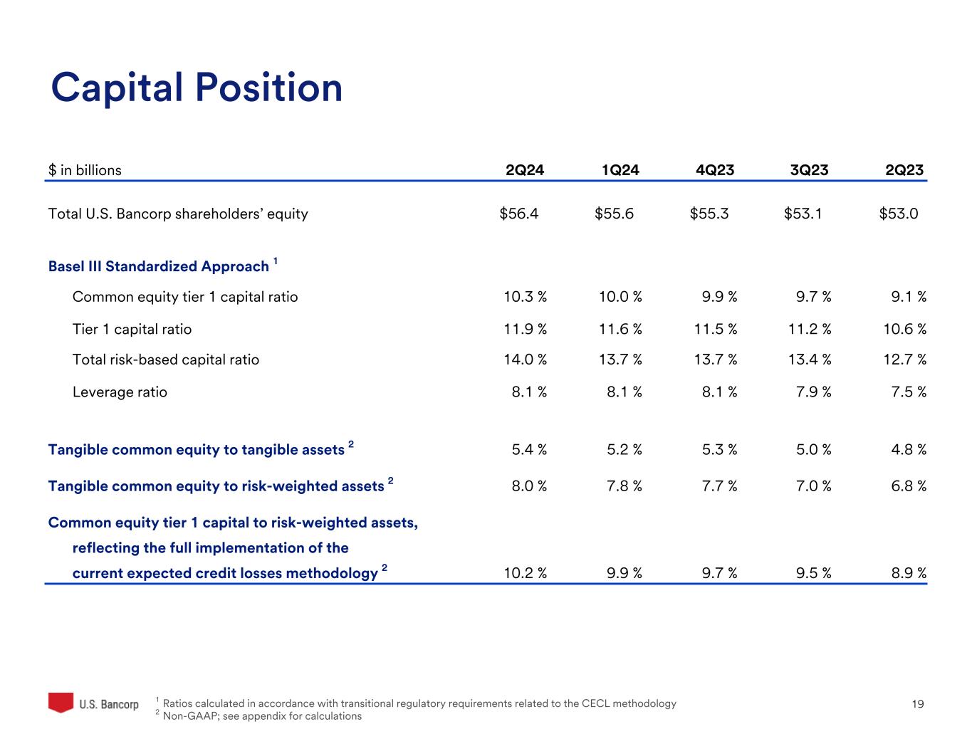 U.S. Bancorp 19 $ in billions 2Q24 1Q24 4Q23 3Q23 2Q23 Total U.S. Bancorp shareholders’ equity $56.4 $55.6 $55.3 $53.1 $53.0 Basel III Standardized Approach 1 Common equity tier 1 capital ratio 10.3 % 10.0 % 9.9 % 9.7 % 9.1 % Tier 1 capital ratio 11.9 % 11.6 % 11.5 % 11.2 % 10.6 % Total risk-based capital ratio 14.0 % 13.7 % 13.7 % 13.4 % 12.7 % Leverage ratio 8.1 % 8.1 % 8.1 % 7.9 % 7.5 % Tangible common equity to tangible assets 2 5.4 % 5.2 % 5.3 % 5.0 % 4.8 % Tangible common equity to risk-weighted assets 2 8.0 % 7.8 % 7.7 % 7.0 % 6.8 % Common equity tier 1 capital to risk-weighted assets, reflecting the full implementation of the current expected credit losses methodology 2 10.2 % 9.9 % 9.7 % 9.5 % 8.9 % 1 Ratios calculated in accordance with transitional regulatory requirements related to the CECL methodology 2 Non-GAAP; see appendix for calculations Capital Position