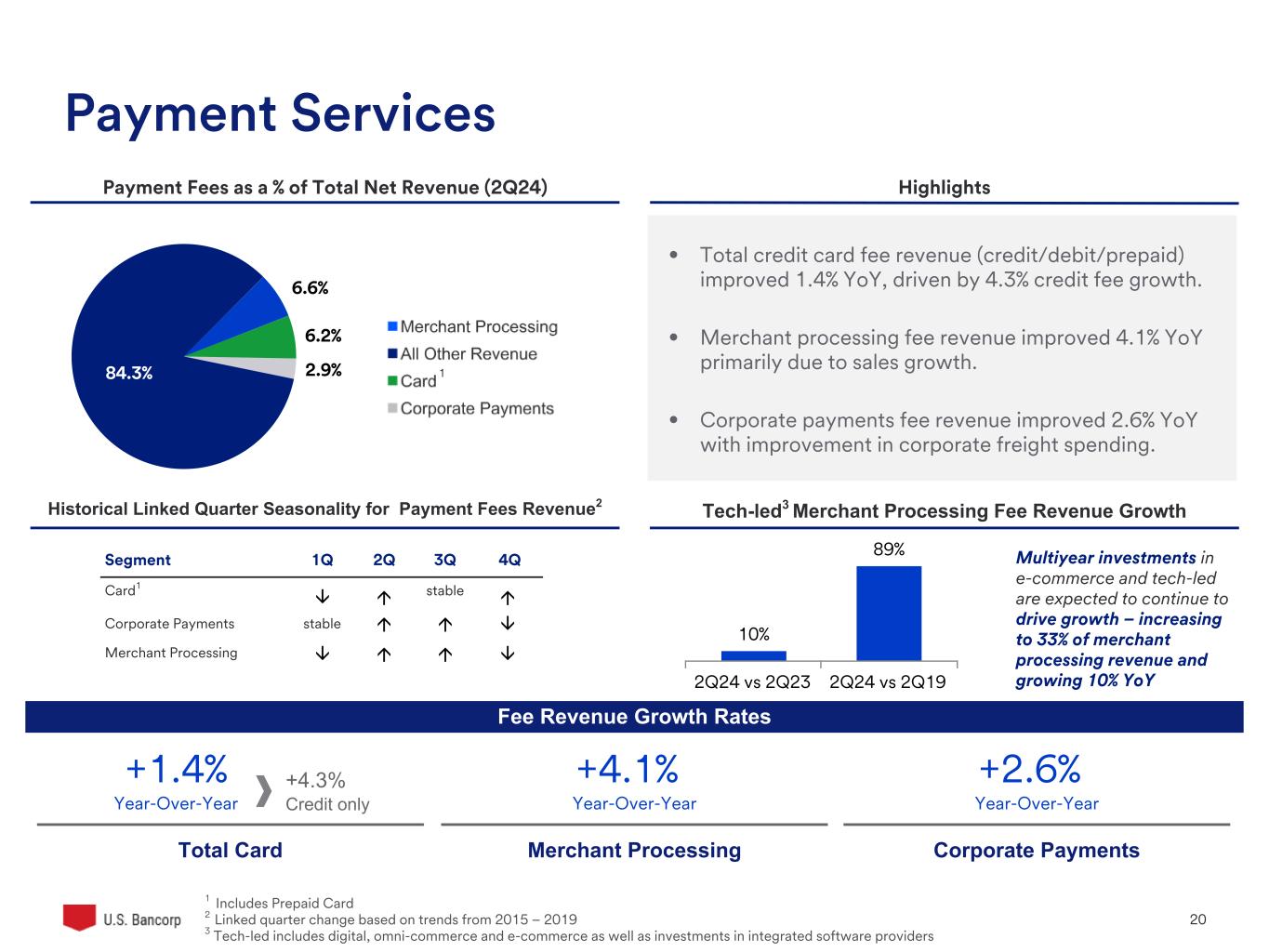 U.S. Bancorp 20 • Total credit card fee revenue (credit/debit/prepaid) improved 1.4% YoY, driven by 4.3% credit fee growth. • Merchant processing fee revenue improved 4.1% YoY primarily due to sales growth. • Corporate payments fee revenue improved 2.6% YoY with improvement in corporate freight spending. Segment 1Q 2Q 3Q 4Q Card1 stable Corporate Payments stable Merchant Processing Merchant Processing Corporate PaymentsTotal Card Payment Fees as a % of Total Net Revenue (2Q24) Highlights Historical Linked Quarter Seasonality for Payment Fees Revenue2 Tech-led3 Merchant Processing Fee Revenue Growth Multiyear investments in e-commerce and tech-led are expected to continue to drive growth – increasing to 33% of merchant processing revenue and growing 10% YoY â â â á á á á á á â +1.4% Year-Over-Year +4.1% Year-Over-Year +2.6% Year-Over-Year 1 1 Includes Prepaid Card 2 Linked quarter change based on trends from 2015 – 2019 3 Tech-led includes digital, omni-commerce and e-commerce as well as investments in integrated software providers Payment Services +4.3% Credit only Fee Revenue Growth Rates 6.6% 6.2% 2.9%84.3% 10% 89% 2Q24 vs 2Q23 2Q24 vs 2Q19