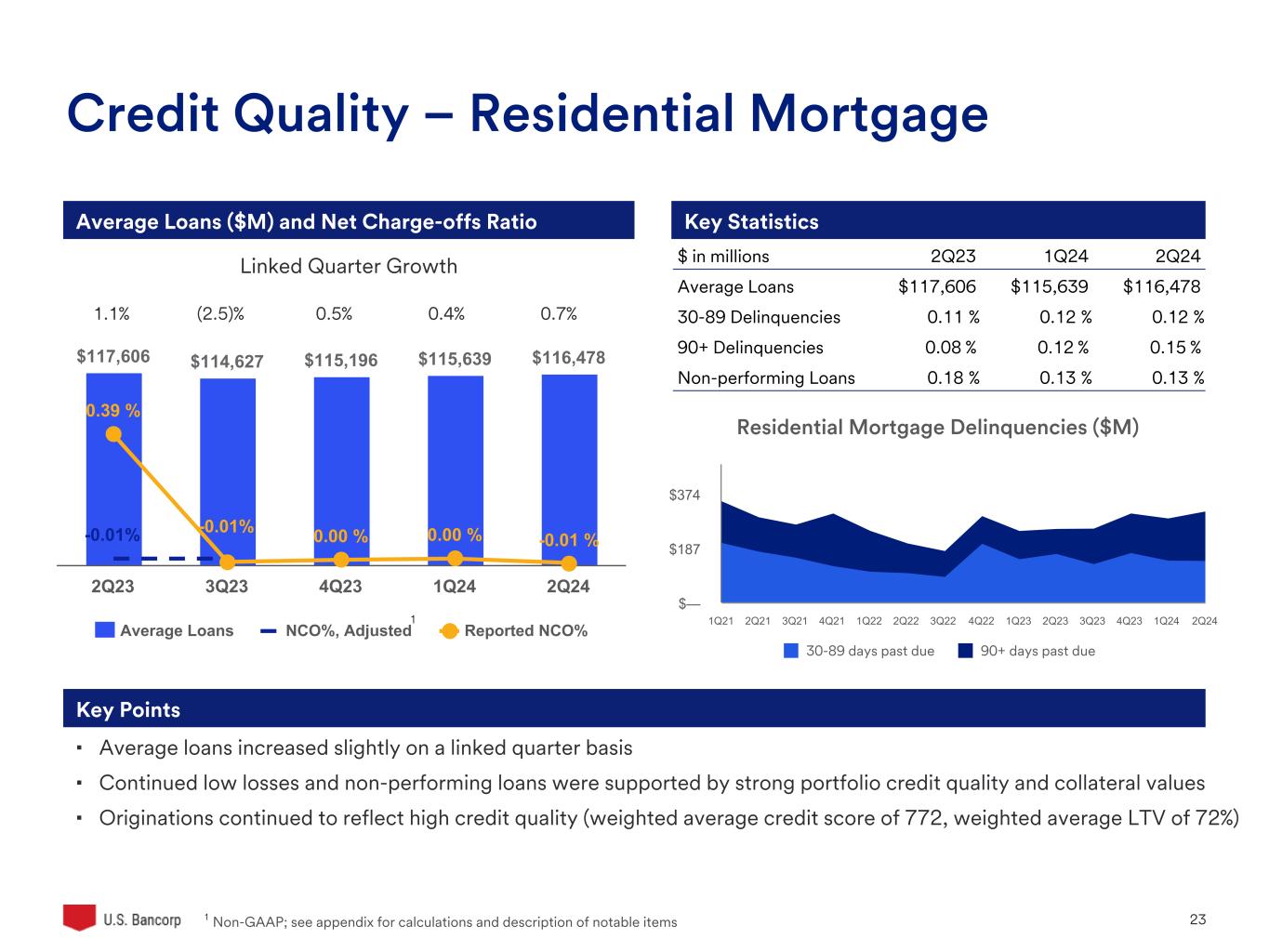 U.S. Bancorp 22 Credit Quality – Commercial Real Estate Key Points Average Loans ($M) and Net Charge-offs Ratio Key Statistics Linked Quarter Growth (1.2)% (1.2)% (0.8)% (1.5)% (1.4)% ▪ Average loans decreased by 1.4% on a linked quarter basis ▪ Non-performing loans ratio increased 14bps, primarily driven by Office 1 SFR = Single Family Residential $54,934 $54,253 $53,825 $53,037 $52,289 0.19 % 0.36 % 0.52 % 0.16 % 0.28 % Average Loans Reported NCO% 2Q23 3Q23 4Q23 1Q24 2Q24 CRE by Loan Type Mortgage 58% Owner Occupied 20% Construction 22% CRE by Property Class SFR Construction 8% Owner Occupied 20% Multi-Family 34% Office 13% Industrial 11% Other 14% $ in millions 2Q23 1Q24 2Q24 Average Loans $54,934 $53,037 $52,289 30-89 Delinquencies 0.13 % 0.04 % 0.04 % 90+ Delinquencies — % — % 0.02 % Non-performing Loans 0.87 % 1.71 % 1.85 % 1