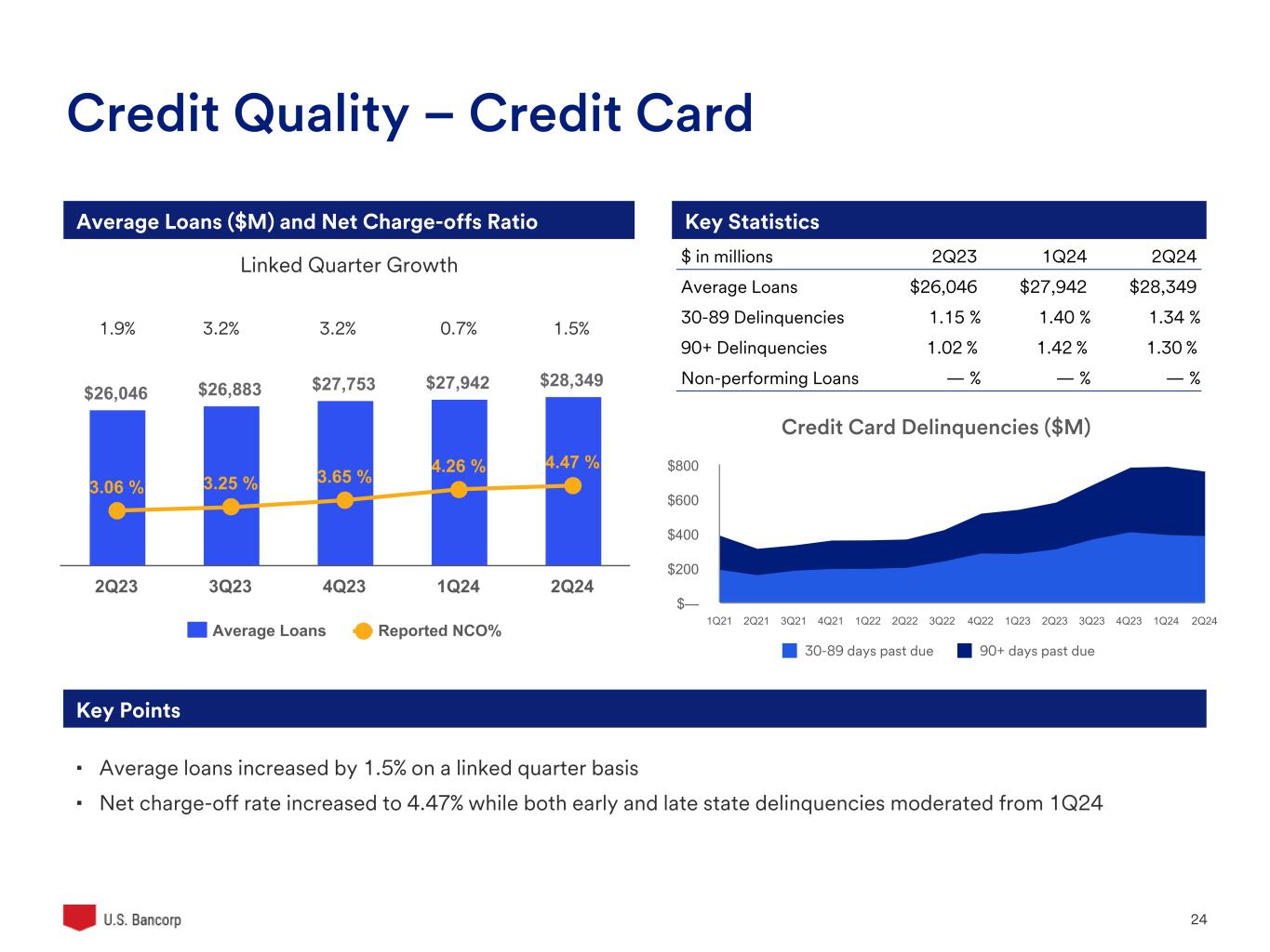 U.S. Bancorp 23 Credit Quality – Residential Mortgage Key Points ▪ Average loans increased slightly on a linked quarter basis ▪ Continued low losses and non-performing loans were supported by strong portfolio credit quality and collateral values ▪ Originations continued to reflect high credit quality (weighted average credit score of 772, weighted average LTV of 72%) Linked Quarter Growth Average Loans ($M) and Net Charge-offs Ratio Key Statistics 1 Non-GAAP; see appendix for calculations and description of notable items $117,606 $114,627 $115,196 $115,639 $116,478 -0.01% 0.39 % 0.00 % 0.00 % -0.01 % Average Loans NCO%, Adjusted Reported NCO% 2Q23 3Q23 4Q23 1Q24 2Q24 $ in millions 2Q23 1Q24 2Q24 Average Loans $117,606 $115,639 $116,478 30-89 Delinquencies 0.11 % 0.12 % 0.12 % 90+ Delinquencies 0.08 % 0.12 % 0.15 % Non-performing Loans 0.18 % 0.13 % 0.13 % 1.1% (2.5)% 0.5% 0.4% 0.7% 1 Residential Mortgage Delinquencies ($M) 30-89 days past due 90+ days past due 1Q21 2Q21 3Q21 4Q21 1Q22 2Q22 3Q22 4Q22 1Q23 2Q23 3Q23 4Q23 1Q24 2Q24 $— $187 $374 -0.01%