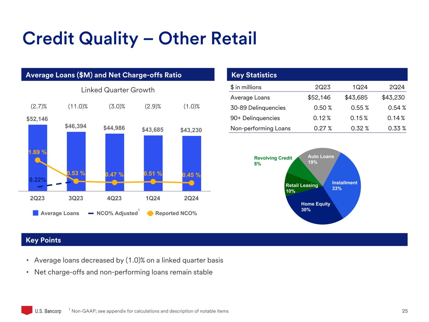 U.S. Bancorp 24 $26,046 $26,883 $27,753 $27,942 $28,349 3.06 % 3.25 % 3.65 % 4.26 % 4.47 % Average Loans Reported NCO% 2Q23 3Q23 4Q23 1Q24 2Q24 Credit Quality – Credit Card Key Points ▪ Average loans increased by 1.5% on a linked quarter basis ▪ Net charge-off rate increased to 4.47% while both early and late state delinquencies moderated from 1Q24 Average Loans ($M) and Net Charge-offs Ratio Key Statistics 1.9% 3.2% 3.2% 0.7% 1.5% Linked Quarter Growth $ in millions 2Q23 1Q24 2Q24 Average Loans $26,046 $27,942 $28,349 30-89 Delinquencies 1.15 % 1.40 % 1.34 % 90+ Delinquencies 1.02 % 1.42 % 1.30 % Non-performing Loans — % — % — % Credit Card Delinquencies ($M) 30-89 days past due 90+ days past due 1Q21 2Q21 3Q21 4Q21 1Q22 2Q22 3Q22 4Q22 1Q23 2Q23 3Q23 4Q23 1Q24 2Q24 $— $200 $400 $600 $800