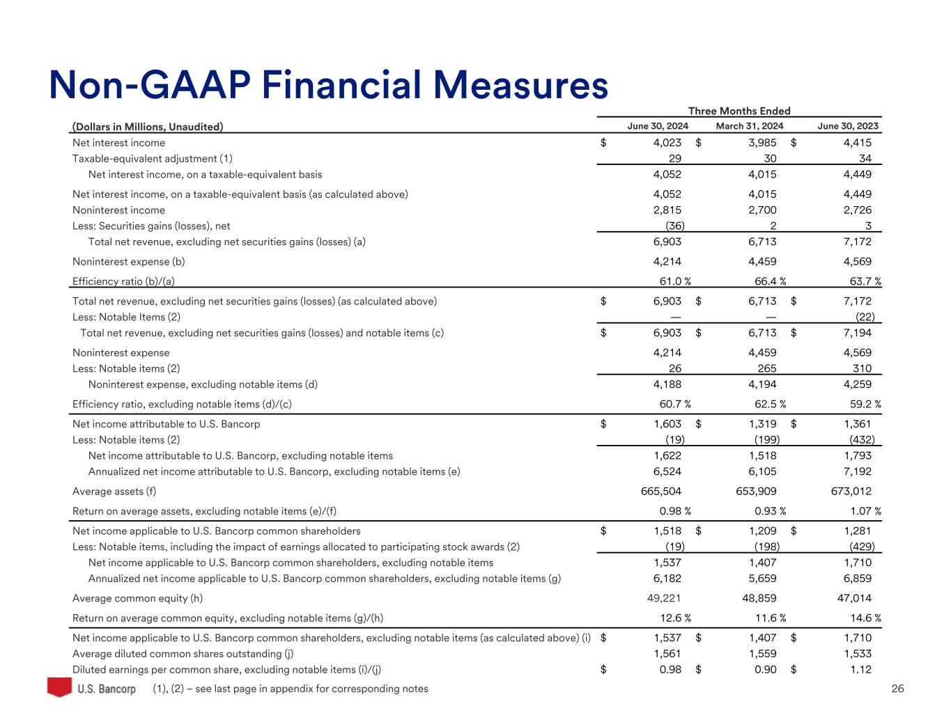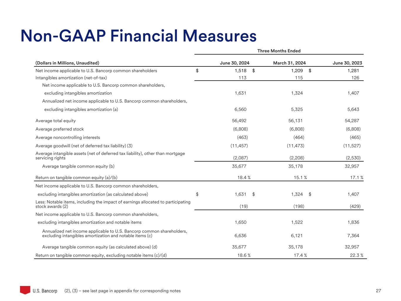 U.S. Bancorp 26 Non-GAAP Financial Measures (1), (2) – see last page in appendix for corresponding notes Three Months Ended (Dollars in Millions, Unaudited) June 30, 2024 March 31, 2024 June 30, 2023 Net interest income $ 4,023 $ 3,985 $ 4,415 Taxable-equivalent adjustment (1) 29 30 34 Net interest income, on a taxable-equivalent basis 4,052 4,015 4,449 Net interest income, on a taxable-equivalent basis (as calculated above) 4,052 4,015 4,449 Noninterest income 2,815 2,700 2,726 Less: Securities gains (losses), net (36) 2 3 Total net revenue, excluding net securities gains (losses) (a) 6,903 6,713 7,172 Noninterest expense (b) 4,214 4,459 4,569 Efficiency ratio (b)/(a) 61.0 % 66.4 % 63.7 % Total net revenue, excluding net securities gains (losses) (as calculated above) $ 6,903 $ 6,713 $ 7,172 Less: Notable Items (2) — — (22) Total net revenue, excluding net securities gains (losses) and notable items (c) $ 6,903 $ 6,713 $ 7,194 Noninterest expense 4,214 4,459 4,569 Less: Notable items (2) 26 265 310 Noninterest expense, excluding notable items (d) 4,188 4,194 4,259 Efficiency ratio, excluding notable items (d)/(c) 60.7 % 62.5 % 59.2 % Net income attributable to U.S. Bancorp $ 1,603 $ 1,319 $ 1,361 Less: Notable items (2) (19) (199) (432) Net income attributable to U.S. Bancorp, excluding notable items 1,622 1,518 1,793 Annualized net income attributable to U.S. Bancorp, excluding notable items (e) 6,524 6,105 7,192 Average assets (f) 665,504 653,909 673,012 Return on average assets, excluding notable items (e)/(f) 0.98 % 0.93 % 1.07 % Net income applicable to U.S. Bancorp common shareholders $ 1,518 $ 1,209 $ 1,281 Less: Notable items, including the impact of earnings allocated to participating stock awards (2) (19) (198) (429) Net income applicable to U.S. Bancorp common shareholders, excluding notable items 1,537 1,407 1,710 Annualized net income applicable to U.S. Bancorp common shareholders, excluding notable items (g) 6,182 5,659 6,859 Average common equity (h) 49,221 48,859 47,014 Return on average common equity, excluding notable items (g)/(h) 12.6 % 11.6 % 14.6 % Net income applicable to U.S. Bancorp common shareholders, excluding notable items (as calculated above) (i) $ 1,537 $ 1,407 $ 1,710 Average diluted common shares outstanding (j) 1,561 1,559 1,533 Diluted earnings per common share, excluding notable items (i)/(j) $ 0.98 $ 0.90 $ 1.12