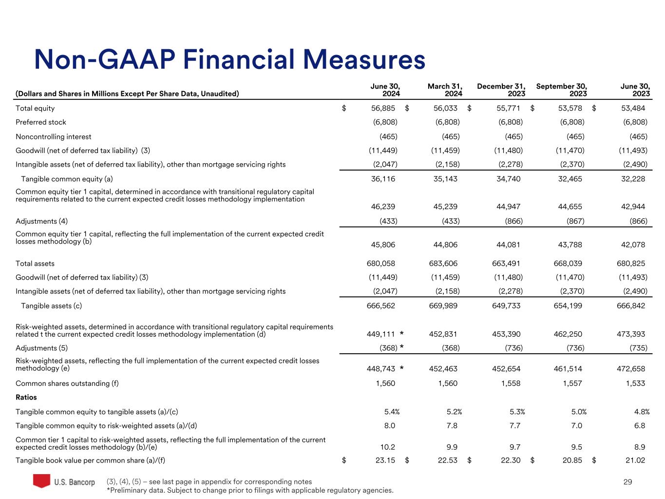 U.S. Bancorp 29 Non-GAAP Financial Measures (Dollars and Shares in Millions Except Per Share Data, Unaudited) June 30, 2024 March 31, 2024 December 31, 2023 September 30, 2023 June 30, 2023 Total equity $ 56,885 $ 56,033 $ 55,771 $ 53,578 $ 53,484 Preferred stock (6,808) (6,808) (6,808) (6,808) (6,808) Noncontrolling interest (465) (465) (465) (465) (465) Goodwill (net of deferred tax liability) (3) (11,449) (11,459) (11,480) (11,470) (11,493) Intangible assets (net of deferred tax liability), other than mortgage servicing rights (2,047) (2,158) (2,278) (2,370) (2,490) Tangible common equity (a) 36,116 35,143 34,740 32,465 32,228 Common equity tier 1 capital, determined in accordance with transitional regulatory capital requirements related to the current expected credit losses methodology implementation 46,239 45,239 44,947 44,655 42,944 Adjustments (4) (433) (433) (866) (867) (866) Common equity tier 1 capital, reflecting the full implementation of the current expected credit losses methodology (b) 45,806 44,806 44,081 43,788 42,078 Total assets 680,058 683,606 663,491 668,039 680,825 Goodwill (net of deferred tax liability) (3) (11,449) (11,459) (11,480) (11,470) (11,493) Intangible assets (net of deferred tax liability), other than mortgage servicing rights (2,047) (2,158) (2,278) (2,370) (2,490) Tangible assets (c) 666,562 669,989 649,733 654,199 666,842 Risk-weighted assets, determined in accordance with transitional regulatory capital requirements related t the current expected credit losses methodology implementation (d) 449,111 452,831 453,390 462,250 473,393 Adjustments (5) (368) (368) (736) (736) (735) Risk-weighted assets, reflecting the full implementation of the current expected credit losses methodology (e) 448,743 452,463 452,654 461,514 472,658 Common shares outstanding (f) 1,560 1,560 1,558 1,557 1,533 Ratios Tangible common equity to tangible assets (a)/(c) 5.4% 5.2% 5.3% 5.0% 4.8% Tangible common equity to risk-weighted assets (a)/(d) 8.0 7.8 7.7 7.0 6.8 Common tier 1 capital to risk-weighted assets, reflecting the full implementation of the current expected credit losses methodology (b)/(e) 10.2 9.9 9.7 9.5 8.9 Tangible book value per common share (a)/(f) $ 23.15 $ 22.53 $ 22.30 $ 20.85 $ 21.02 (3), (4), (5) – see last page in appendix for corresponding notes *Preliminary data. Subject to change prior to filings with applicable regulatory agencies. * * *