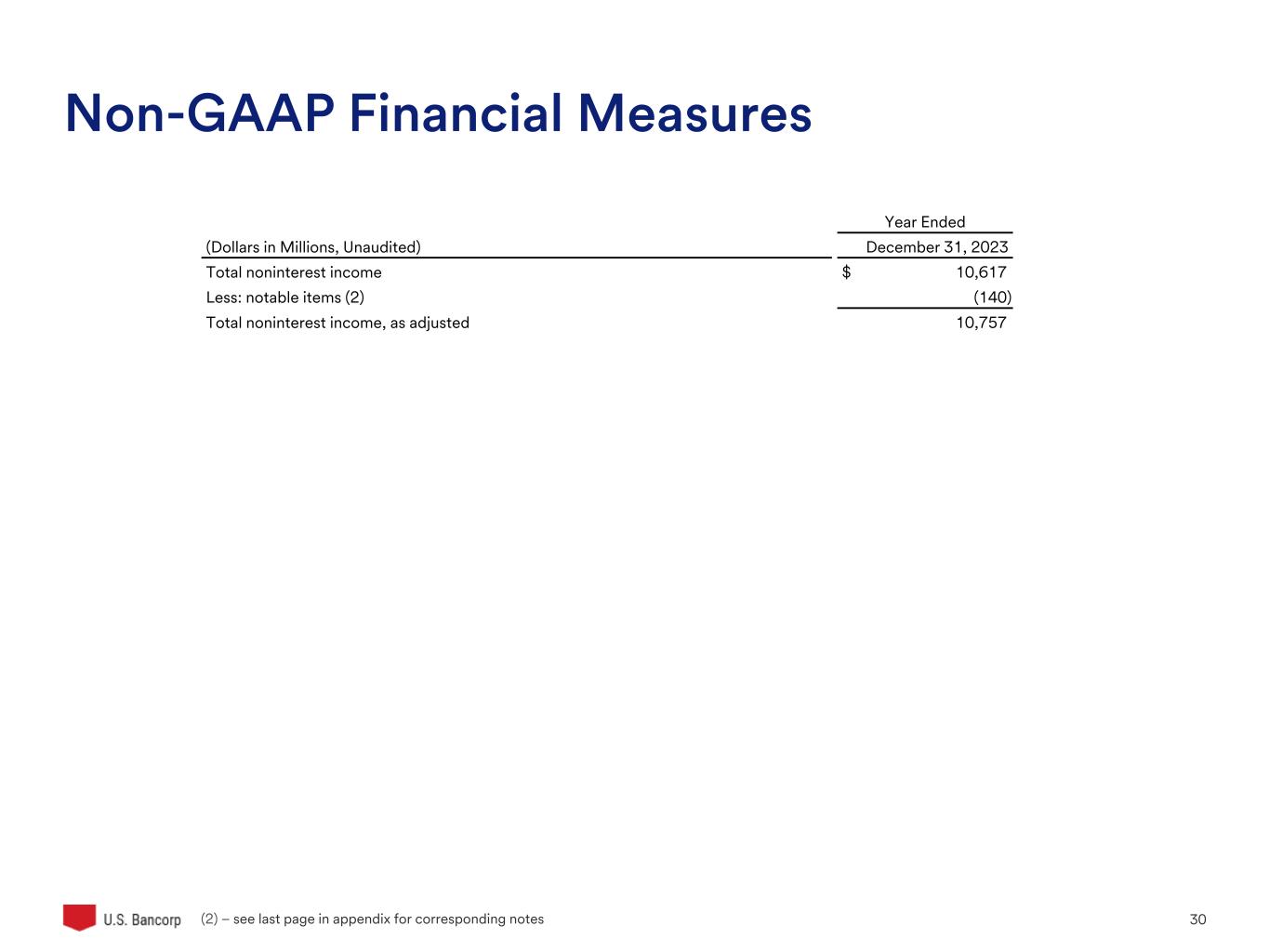 U.S. Bancorp 30 Non-GAAP Financial Measures (2) – see last page in appendix for corresponding notes Year Ended (Dollars in Millions, Unaudited) December 31, 2023 Total noninterest income $ 10,617 Less: notable items (2) (140) Total noninterest income, as adjusted 10,757