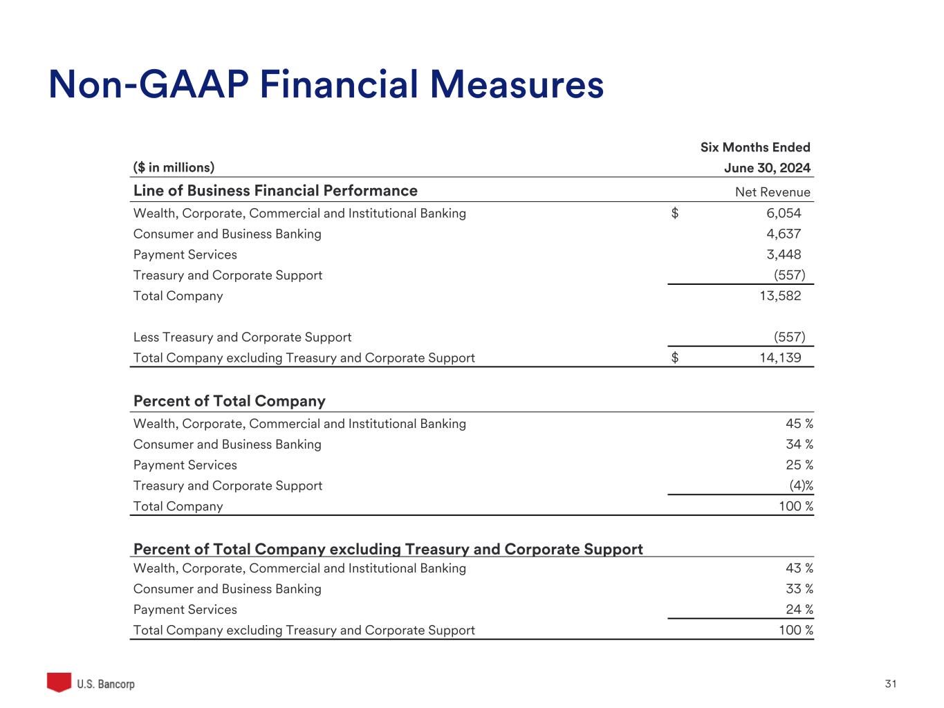 U.S. Bancorp 31 Non-GAAP Financial Measures ($ in millions) Six Months Ended June 30, 2024 Line of Business Financial Performance Net Revenue Wealth, Corporate, Commercial and Institutional Banking $ 6,054 Consumer and Business Banking 4,637 Payment Services 3,448 Treasury and Corporate Support (557) Total Company 13,582 Less Treasury and Corporate Support (557) Total Company excluding Treasury and Corporate Support $ 14,139 Percent of Total Company Wealth, Corporate, Commercial and Institutional Banking 45 % Consumer and Business Banking 34 % Payment Services 25 % Treasury and Corporate Support (4) % Total Company 100 % Percent of Total Company excluding Treasury and Corporate Support Wealth, Corporate, Commercial and Institutional Banking 43 % Consumer and Business Banking 33 % Payment Services 24 % Total Company excluding Treasury and Corporate Support 100 %