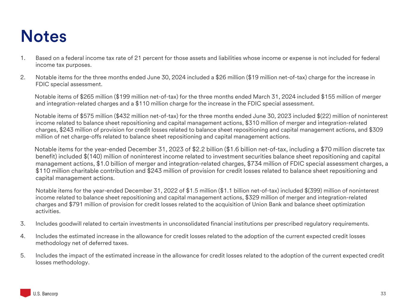 U.S. Bancorp 33 Notes 1. Based on a federal income tax rate of 21 percent for those assets and liabilities whose income or expense is not included for federal income tax purposes. 2. Notable items for the three months ended June 30, 2024 included a $26 million ($19 million net-of-tax) charge for the increase in FDIC special assessment. Notable items of $265 million ($199 million net-of-tax) for the three months ended March 31, 2024 included $155 million of merger and integration-related charges and a $110 million charge for the increase in the FDIC special assessment. Notable items of $575 million ($432 million net-of-tax) for the three months ended June 30, 2023 included $(22) million of noninterest income related to balance sheet repositioning and capital management actions, $310 million of merger and integration-related charges, $243 million of provision for credit losses related to balance sheet repositioning and capital management actions, and $309 million of net charge-offs related to balance sheet repositioning and capital management actions. Notable items for the year-ended December 31, 2023 of $2.2 billion ($1.6 billion net-of-tax, including a $70 million discrete tax benefit) included $(140) million of noninterest income related to investment securities balance sheet repositioning and capital management actions, $1.0 billion of merger and integration-related charges, $734 million of FDIC special assessment charges, a $110 million charitable contribution and $243 million of provision for credit losses related to balance sheet repositioning and capital management actions. Notable items for the year-ended December 31, 2022 of $1.5 million ($1.1 billion net-of-tax) included $(399) million of noninterest income related to balance sheet repositioning and capital management actions, $329 million of merger and integration-related charges and $791 million of provision for credit losses related to the acquisition of Union Bank and balance sheet optimization activities. 3. Includes goodwill related to certain investments in unconsolidated financial institutions per prescribed regulatory requirements. 4. Includes the estimated increase in the allowance for credit losses related to the adoption of the current expected credit losses methodology net of deferred taxes. 5. Includes the impact of the estimated increase in the allowance for credit losses related to the adoption of the current expected credit losses methodology.