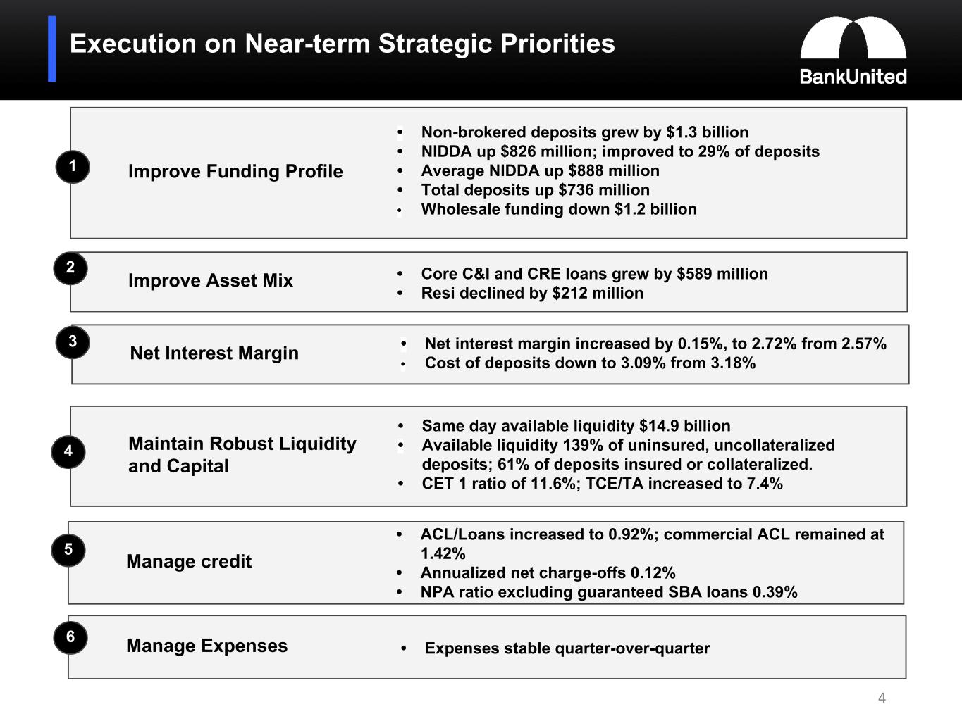 Improve Asset Mix Improve Funding Profile 2 Maintain Robust Liquidity and Capital Net Interest Margin Execution on Near-term Strategic Priorities 4 3 4 1 • Non-brokered deposits grew by $1.3 billion • NIDDA up $826 million; improved to 29% of deposits • Average NIDDA up $888 million • Total deposits up $736 million • Wholesale funding down $1.2 billion • Core C&I and CRE loans grew by $589 million • Resi declined by $212 million • Net interest margin increased by 0.15%, to 2.72% from 2.57% • Cost of deposits down to 3.09% from 3.18% • Same day available liquidity $14.9 billion • Available liquidity 139% of uninsured, uncollateralized deposits; 61% of deposits insured or collateralized. • CET 1 ratio of 11.6%; TCE/TA increased to 7.4% Manage credit • ACL/Loans increased to 0.92%; commercial ACL remained at 1.42% • Annualized net charge-offs 0.12% • NPA ratio excluding guaranteed SBA loans 0.39% 5 Manage Expenses • Expenses stable quarter-over-quarter 6
