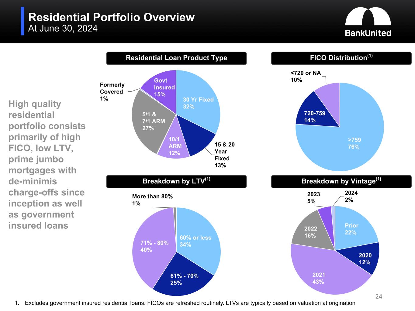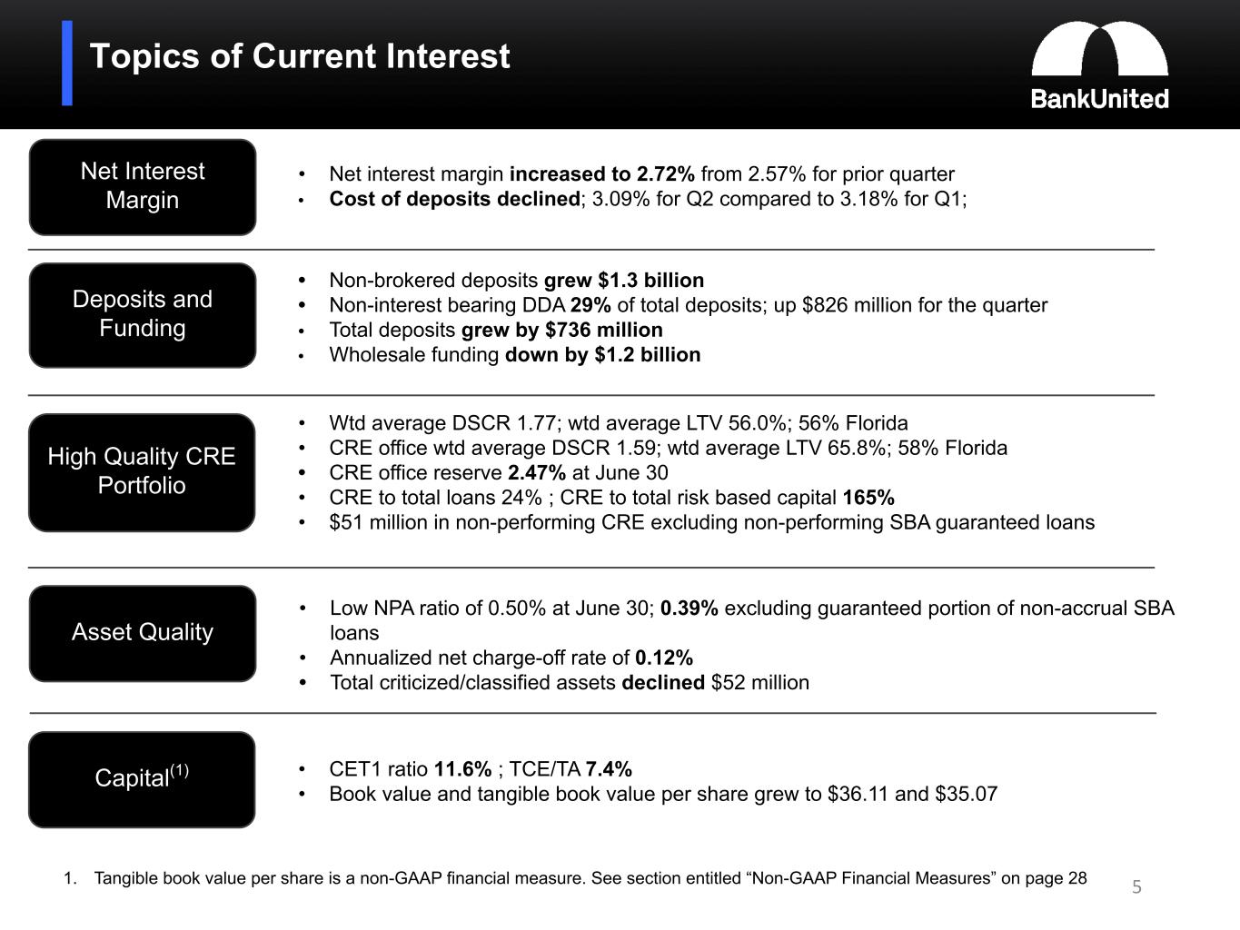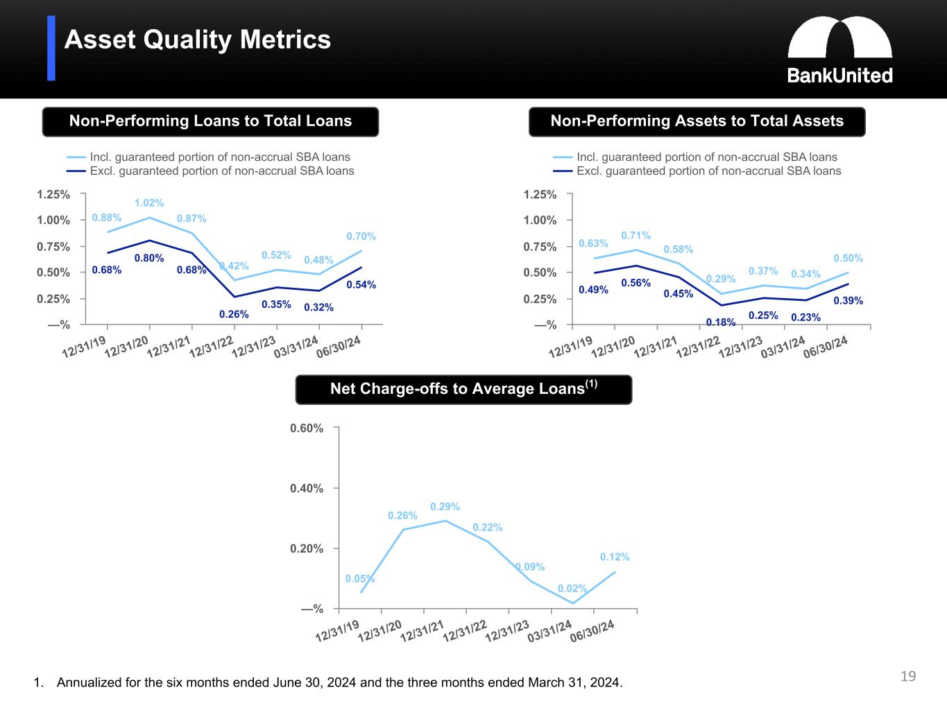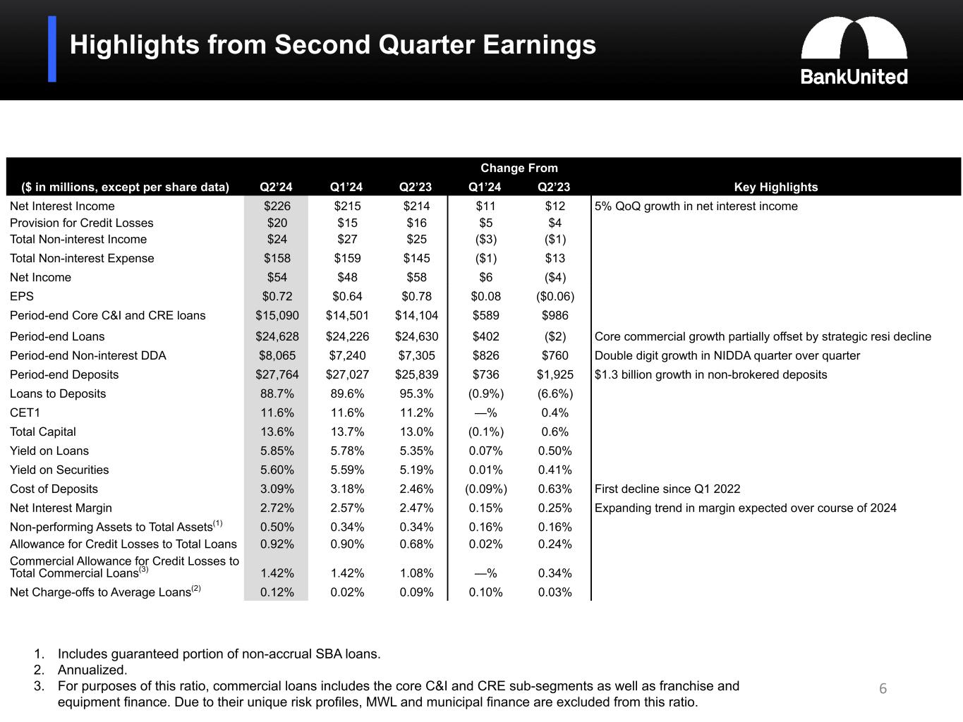 (5) Non-performing loans and assets include the guaranteed portion of non-accrual SBA loans totaling $39.0 million or 0.16% of total loans and 0.11% of total assets at June 30, 2024, $40.0 million or 0.16% of total loans and 0.11% of total assets at March 31, 2024, and $41.8 million or 0.17% of total loans and 0.12% of total assets at December 31, 2023.