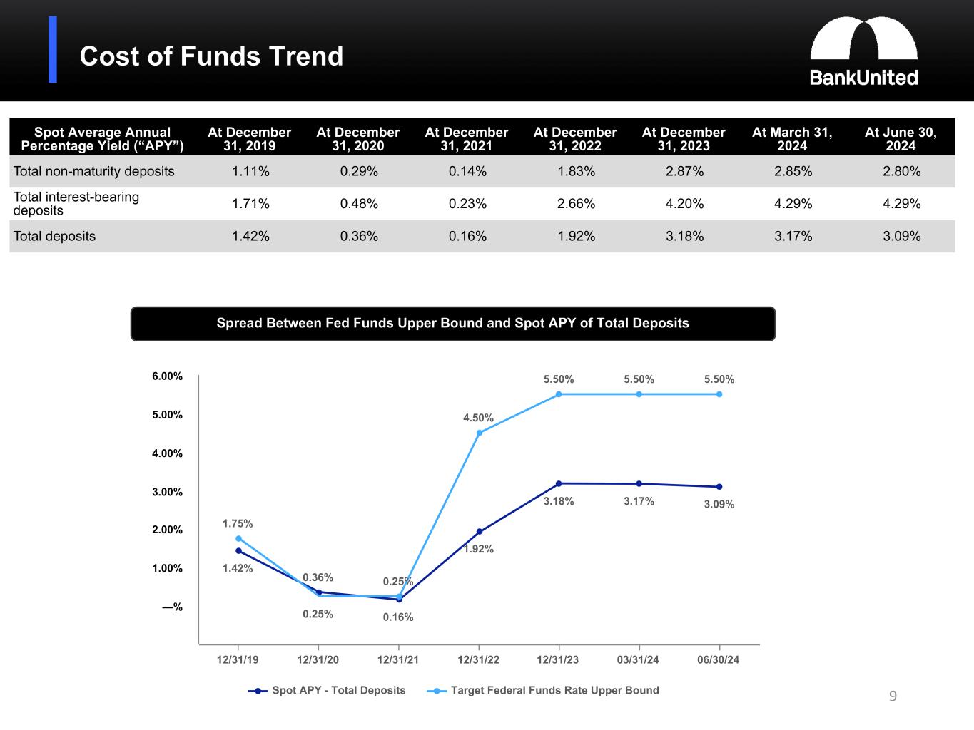 •The average cost of total deposits declined by 0.09% to 3.09% for the quarter ended June 30, 2024 from 3.18% for the quarter ended March 31, 2024. The spot APY of total deposits declined to 3.09% at June 30, 2024 from 3.17% at March 31, 2024. The spot APY of interest bearing deposits was stable at 4.29% at both June 30, 2024 and March 31, 2024.