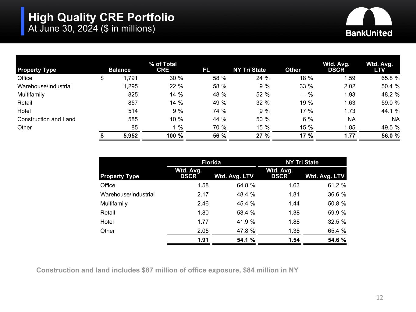 •At June 30, 2024, the weighted average LTV of the CRE portfolio was 56.0%, the weighted average DSCR was 1.77, 56% of the portfolio was collateralized by properties located in Florida and 27% was collateralized by properties located in the New York tri-state area. For the office sub-segment, the weighted average LTV was 65.8%, the weighted average DSCR was 1.59, 58% was collateralized by properties in Florida, substantially all of which was suburban, and 24% was collateralized by properties located in the New York tri-state area.
