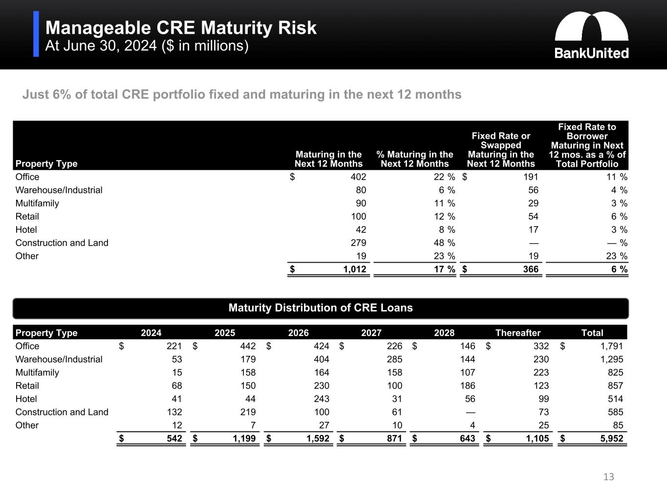 High Quality CRE Portfolio At June 30, 2024 ($ in millions) Property Type Balance % of Total CRE FL NY Tri State Other Wtd. Avg. DSCR Wtd. Avg. LTV Office $ 1,791 30 % 58 % 24 % 18 % 1.59 65.8 % Warehouse/Industrial 1,295 22 % 58 % 9 % 33 % 2.02 50.4 % Multifamily 825 14 % 48 % 52 % — % 1.93 48.2 % Retail 857 14 % 49 % 32 % 19 % 1.63 59.0 % Hotel 514 9 % 74 % 9 % 17 % 1.73 44.1 % Construction and Land 585 10 % 44 % 50 % 6 % NA NA Other 85 1 % 70 % 15 % 15 % 1.85 49.5 % $ 5,952 100 % 56 % 27 % 17 % 1.77 56.0 % 12 Florida NY Tri State Property Type Wtd. Avg. DSCR Wtd. Avg. LTV Wtd. Avg. DSCR Wtd. Avg. LTV Office 1.58 64.8 % 1.63 61.2 % Warehouse/Industrial 2.17 48.4 % 1.81 36.6 % Multifamily 2.46 45.4 % 1.44 50.8 % Retail 1.80 58.4 % 1.38 59.9 % Hotel 1.77 41.9 % 1.88 32.5 % Other 2.05 47.8 % 1.38 65.4 % 1.91 54.1 % 1.54 54.6 % Construction and land includes $87 million of office exposure, $84 million in NY