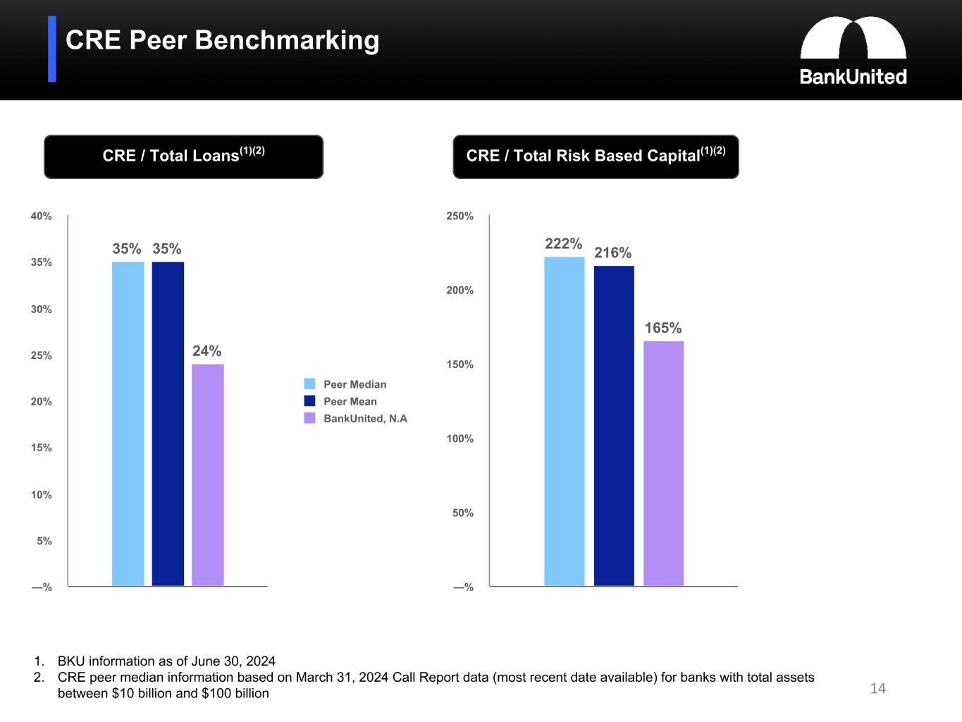 Manageable CRE Maturity Risk At June 30, 2024 ($ in millions) Property Type Maturing in the Next 12 Months % Maturing in the Next 12 Months Fixed Rate or Swapped Maturing in the Next 12 Months Fixed Rate to Borrower Maturing in Next 12 mos. as a % of Total Portfolio Office $ 402 22 % $ 191 11 % Warehouse/Industrial 80 6 % 56 4 % Multifamily 90 11 % 29 3 % Retail 100 12 % 54 6 % Hotel 42 8 % 17 3 % Construction and Land 279 48 % — — % Other 19 23 % 19 23 % $ 1,012 17 % $ 366 6 % 13 Just 6% of total CRE portfolio fixed and maturing in the next 12 months Property Type 2024 2025 2026 2027 2028 Thereafter Total Office $ 221 $ 442 $ 424 $ 226 $ 146 $ 332 $ 1,791 Warehouse/Industrial 53 179 404 285 144 230 1,295 Multifamily 15 158 164 158 107 223 825 Retail 68 150 230 100 186 123 857 Hotel 41 44 243 31 56 99 514 Construction and Land 132 219 100 61 — 73 585 Other 12 7 27 10 4 25 85 $ 542 $ 1,199 $ 1,592 $ 871 $ 643 $ 1,105 $ 5,952 Maturity Distribution of CRE Loans