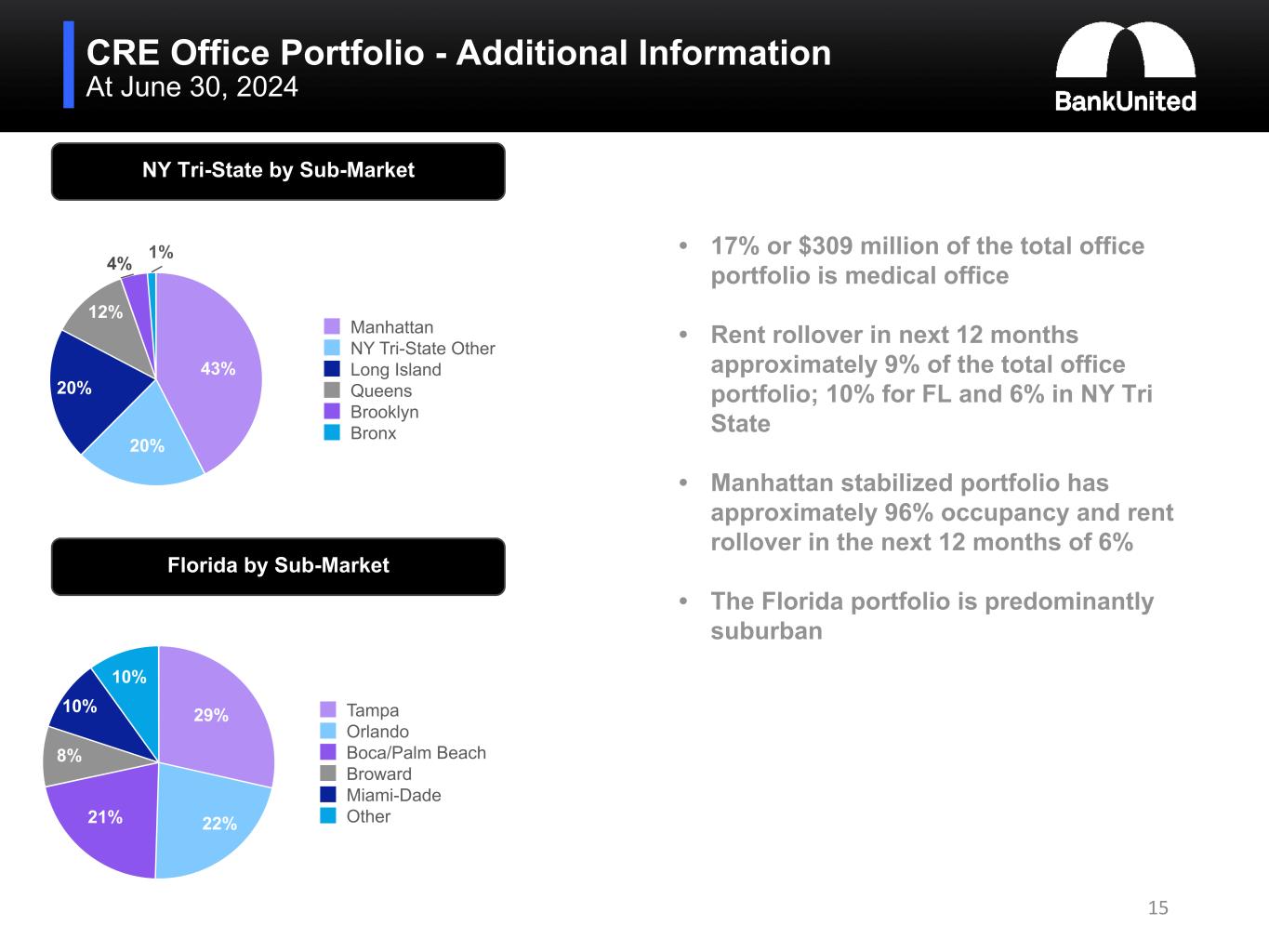 CRE Peer Benchmarking 14 35% 35% 24% Peer Median Peer Mean BankUnited, N.A —% 5% 10% 15% 20% 25% 30% 35% 40% 222% 216% 165% —% 50% 100% 150% 200% 250% 1. BKU information as of June 30, 2024 2. CRE peer median information based on March 31, 2024 Call Report data (most recent date available) for banks with total assets between $10 billion and $100 billion CRE / Total Loans(1)(2) CRE / Total Risk Based Capital(1)(2)