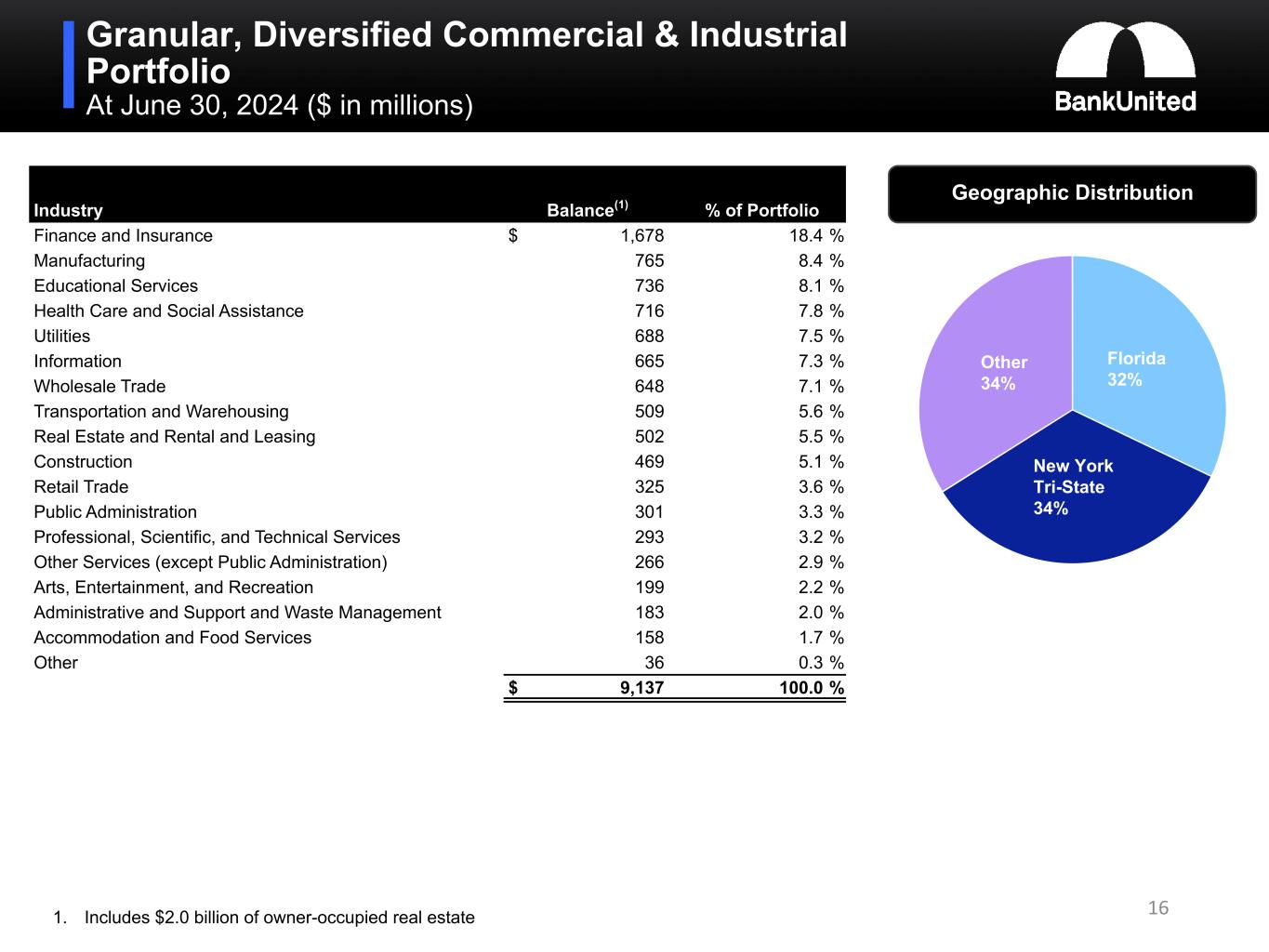 Granular, Diversified Commercial & Industrial Portfolio At June 30, 2024 ($ in millions) Industry Balance(1) % of Portfolio Finance and Insurance $ 1,678 18.4 % Manufacturing 765 8.4 % Educational Services 736 8.1 % Health Care and Social Assistance 716 7.8 % Utilities 688 7.5 % Information 665 7.3 % Wholesale Trade 648 7.1 % Transportation and Warehousing 509 5.6 % Real Estate and Rental and Leasing 502 5.5 % Construction 469 5.1 % Retail Trade 325 3.6 % Public Administration 301 3.3 % Professional, Scientific, and Technical Services 293 3.2 % Other Services (except Public Administration) 266 2.9 % Arts, Entertainment, and Recreation 199 2.2 % Administrative and Support and Waste Management 183 2.0 % Accommodation and Food Services 158 1.7 % Other 36 0.3 % $ 9,137 100.0 % 161. Includes $2.0 billion of owner-occupied real estate Geographic Distribution Florida 32% New York Tri-State 34% Other 34%