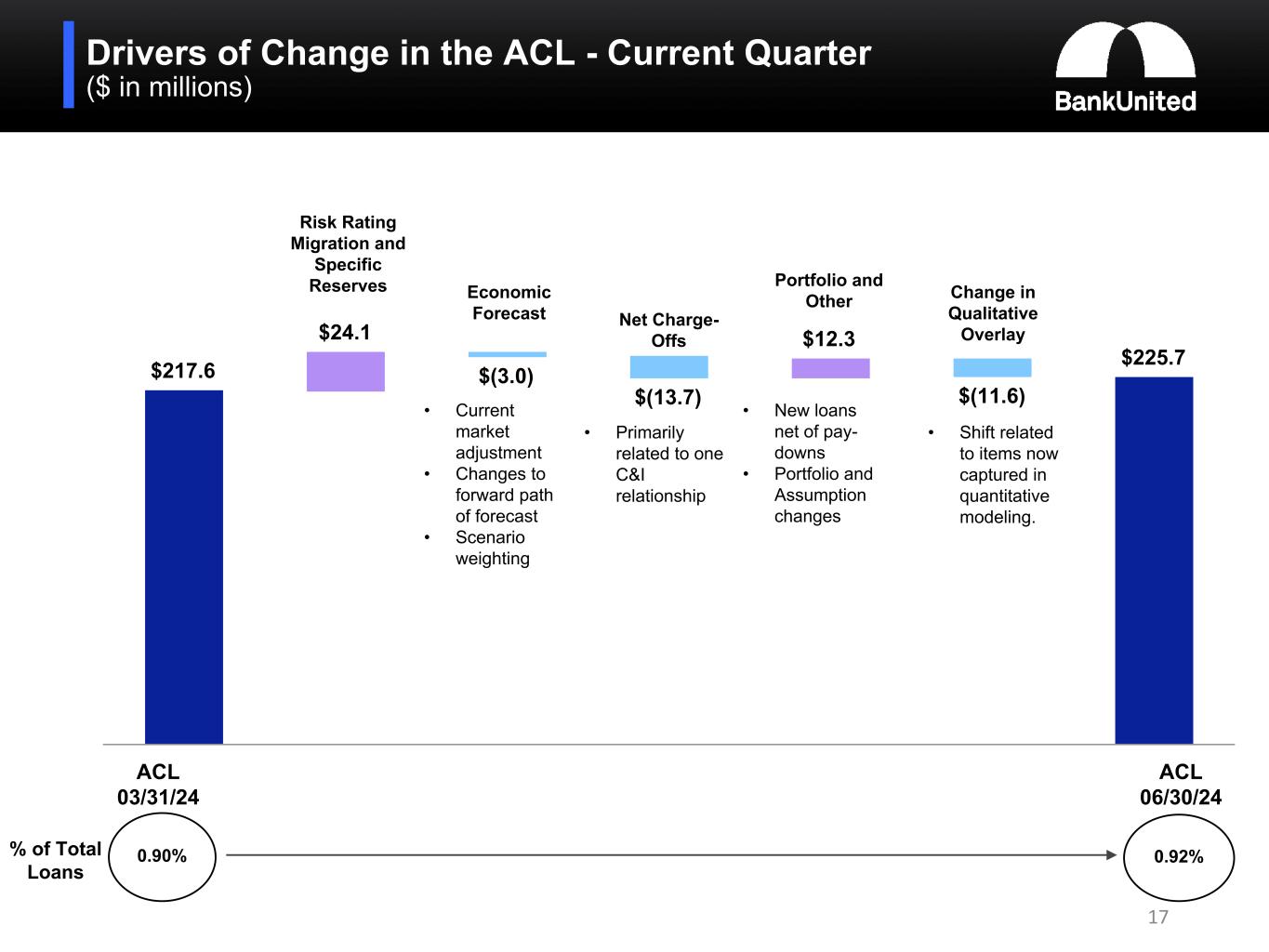 The ACL at June 30, 2024 represents management's estimate of lifetime expected credit losses given an assessment of historical data, current conditions, and a reasonable and supportable economic forecast as of the balance sheet date. For the quarter ended June 30, 2024, the provision for credit losses, including both funded and unfunded loan commitments, was $19.5 million, compared to $15.3 million for the immediately preceding quarter ended March 31, 2024. Significant factors impacting the provision for credit losses for the quarter ended June 30, 2024 were new loan production, risk rating migration and changes in portfolio characteristics and an increase in certain specific reserves.