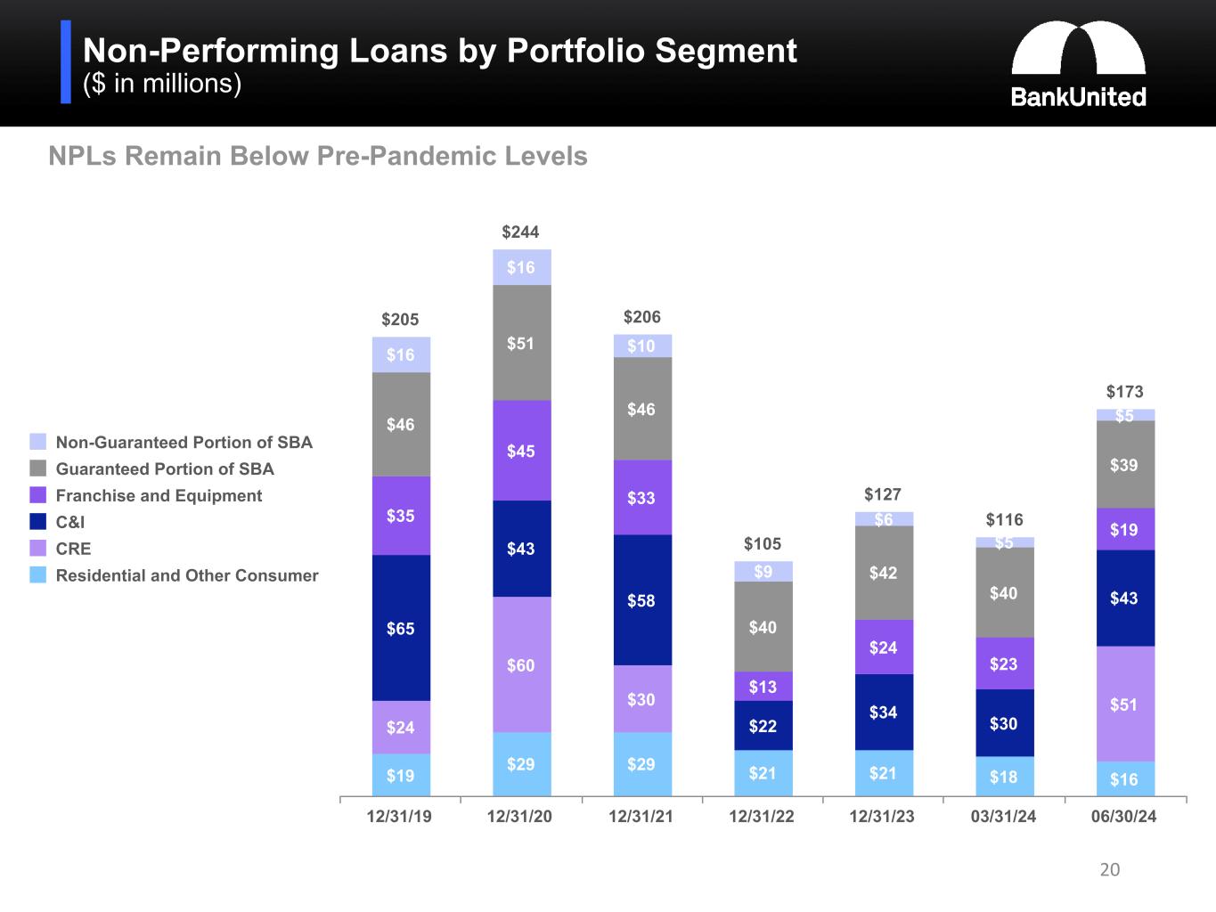 Non-Performing Loans by Portfolio Segment ($ in millions) 20 $205 $244 $206 $105 $127 $116 $173 $19 $29 $29 $21 $21 $18 $16 $24 $60 $30 $51 $65 $43 $58 $22 $34 $30 $43 $35 $45 $33 $13 $24 $23 $19 $46 $51 $46 $40 $42 $40 $39 $16 $16 $10 $9 $6 $5 $5 Non-Guaranteed Portion of SBA Guaranteed Portion of SBA Franchise and Equipment C&I CRE Residential and Other Consumer 12/31/19 12/31/20 12/31/21 12/31/22 12/31/23 03/31/24 06/30/24 NPLs Remain Below Pre-Pandemic Levels