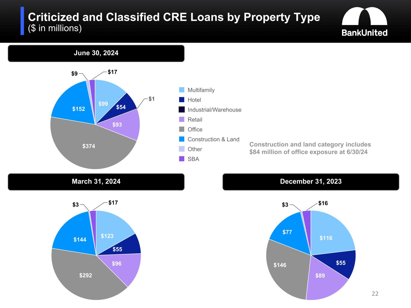 Criticized and Classified Loans ($ in millions) 21 Commercial Real Estate(1) Commercial(1)(2) Special Mention Substandard Accruing Substandard Non-accruing and Doubtful 12/31/19 12/31/20 12/31/21 12/31/22 12/31/23 03/31/24 06/30/24 $— $100 $200 $300 $400 $500 $600 $700 $800 $900 $1,000 12/31/19 12/31/20 12/31/21 12/31/22 12/31/23 03/31/24 06/30/24 $— $100 $200 $300 $400 $500 $600 $700 $800 $900 $1,000 1. Excludes SBA 2. Includes Pinnacle, franchise and equipment finance, and MWL