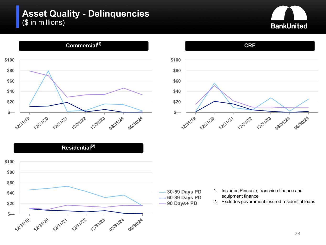 Asset Quality - Delinquencies ($ in millions) 23 Commercial(1) CRE 12/31/19 12/31/20 12/31/21 12/31/22 12/31/23 03/31/24 06/30/24 $— $20 $40 $60 $80 $100 Residential(2) 12/31/19 12/31/20 12/31/21 12/31/22 12/31/23 03/31/24 06/30/24 $— $20 $40 $60 $80 $100 30-59 Days PD 60-89 Days PD 90 Days+ PD 12/31/19 12/31/20 12/31/21 12/31/22 12/31/23 03/31/24 06/30/24 $— $20 $40 $60 $80 $100 1. Includes Pinnacle, franchise finance and equipment finance 2. Excludes government insured residential loans