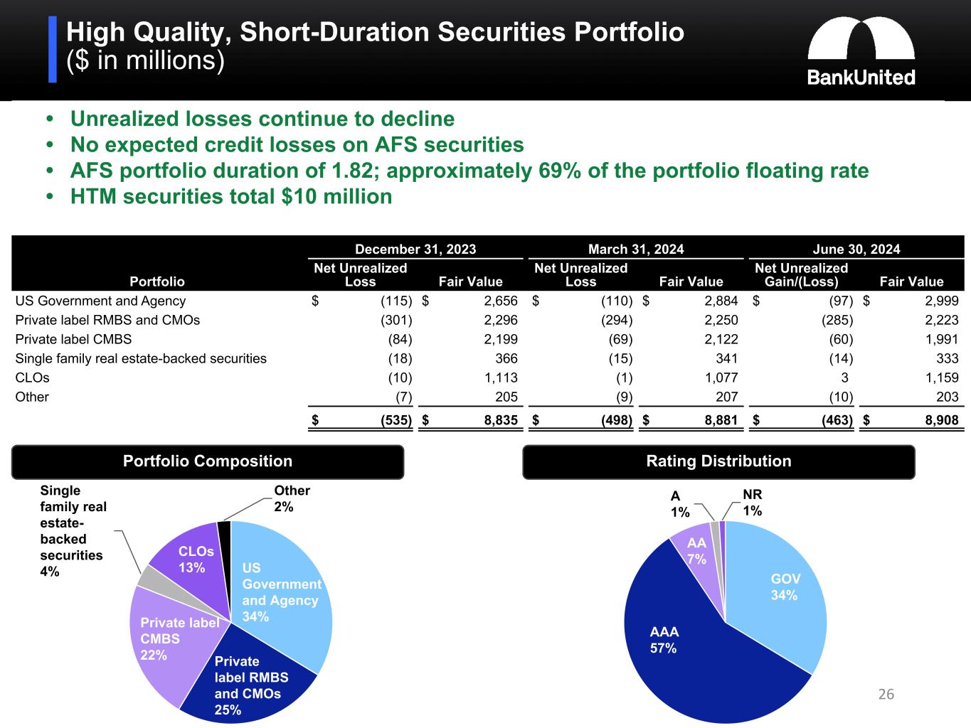 •The net unrealized pre-tax loss on the available for sale ("AFS") securities portfolio continued to improve, declining by $36 million, to 5% of amortized cost, for the quarter ended June 30, 2024. The duration of our AFS securities portfolio remained short, at 1.82 as of June 30, 2024. Held to maturity securities were not significant.