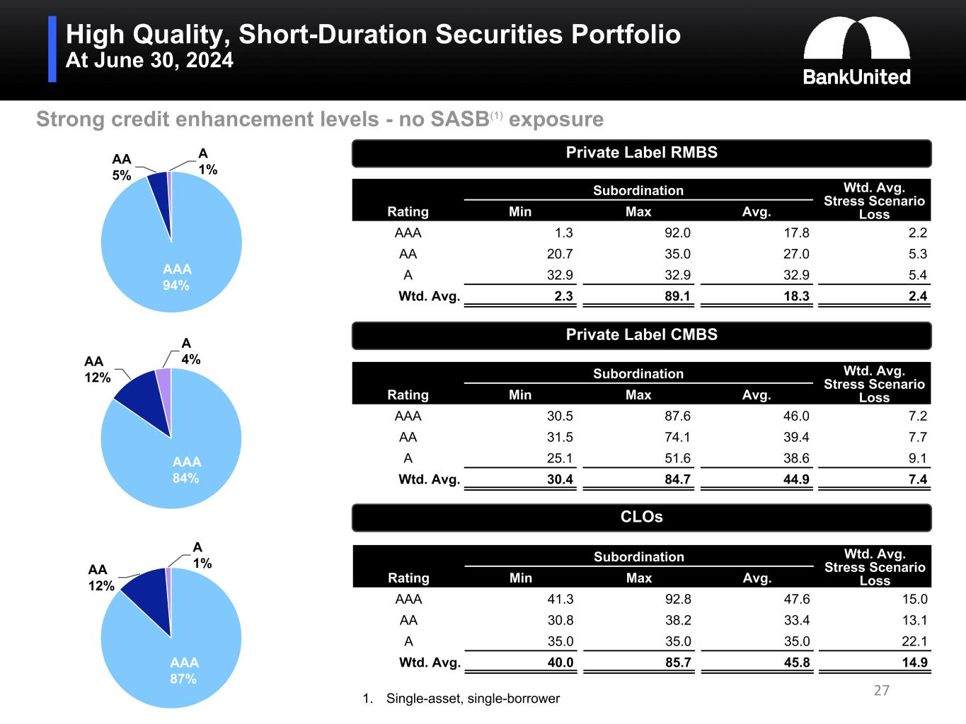 High Quality, Short-Duration Securities Portfolio At June 30, 2024 Strong credit enhancement levels - no SASB(1) exposure Private Label RMBS Subordination Wtd. Avg. Stress Scenario LossRating Min Max Avg. AAA 1.3 92.0 17.8 2.2 AA 20.7 35.0 27.0 5.3 A 32.9 32.9 32.9 5.4 Wtd. Avg. 2.3 89.1 18.3 2.4 Private Label CMBS Subordination Wtd. Avg. Stress Scenario LossRating Min Max Avg. AAA 30.5 87.6 46.0 7.2 AA 31.5 74.1 39.4 7.7 A 25.1 51.6 38.6 9.1 Wtd. Avg. 30.4 84.7 44.9 7.4 CLOs Subordination Wtd. Avg. Stress Scenario LossRating Min Max Avg. AAA 41.3 92.8 47.6 15.0 AA 30.8 38.2 33.4 13.1 A 35.0 35.0 35.0 22.1 Wtd. Avg. 40.0 85.7 45.8 14.9 AAA 94% AA 5% A 1% AAA 84% AA 12% A 4% AAA 87% AA 12% A 1% 271. Single-asset, single-borrower