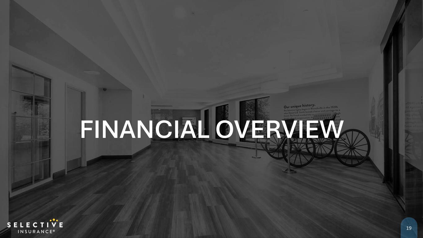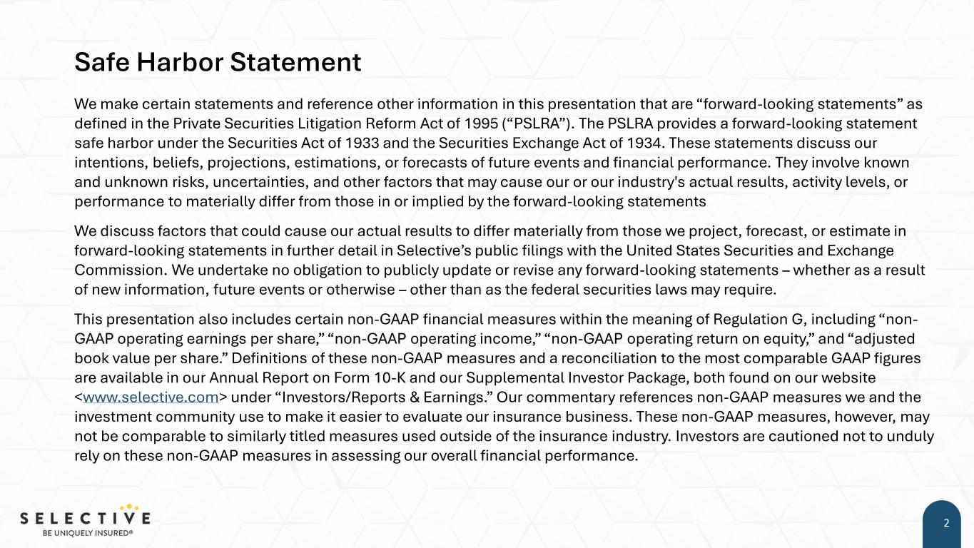 Safe Harbor Statement We make certain statements and reference other information in this presentation that are “forward-looking statements” as defined in the Private Securities Litigation Reform Act of 1995 (“PSLRA”). The PSLRA provides a forward-looking statement safe harbor under the Securities Act of 1933 and the Securities Exchange Act of 1934. These statements discuss our intentions, beliefs, projections, estimations, or forecasts of future events and financial performance. They involve known and unknown risks, uncertainties, and other factors that may cause our or our industry's actual results, activity levels, or performance to materially differ from those in or implied by the forward-looking statements We discuss factors that could cause our actual results to differ materially from those we project, forecast, or estimate in forward-looking statements in further detail in Selective’s public filings with the United States Securities and Exchange Commission. We undertake no obligation to publicly update or revise any forward-looking statements – whether as a result of new information, future events or otherwise – other than as the federal securities laws may require. This presentation also includes certain non-GAAP financial measures within the meaning of Regulation G, including “non- GAAP operating earnings per share,” “non-GAAP operating income,” “non-GAAP operating return on equity,” and “adjusted book value per share.” Definitions of these non-GAAP measures and a reconciliation to the most comparable GAAP figures are available in our Annual Report on Form 10-K and our Supplemental Investor Package, both found on our website <www.selective.com> under “Investors/Reports & Earnings.” Our commentary references non-GAAP measures we and the investment community use to make it easier to evaluate our insurance business. These non-GAAP measures, however, may not be comparable to similarly titled measures used outside of the insurance industry. Investors are cautioned not to unduly rely on these non-GAAP measures in assessing our overall financial performance. 2