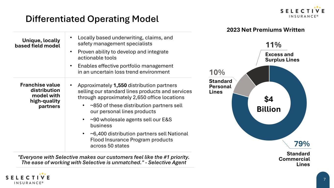 Sustainable Competitive Advantages 6 Our success is based on a unique combination of competitive advantages. Taken together, they create a winning formula for Selective. Our unique field model, placing empowered underwriting staff in proximity to our distribution partners and customers Our ability to develop and integrate sophisticated tools for risk selection, pricing, and claims management Our franchise value distribution model, defined by meaningful and close business relationships with a group of top-notch independent agents Our commitment to delivering a superior omni-channel customer experience, enhanced by digital platforms and value-added services Our highly engaged and aligned team of skilled and committed employees