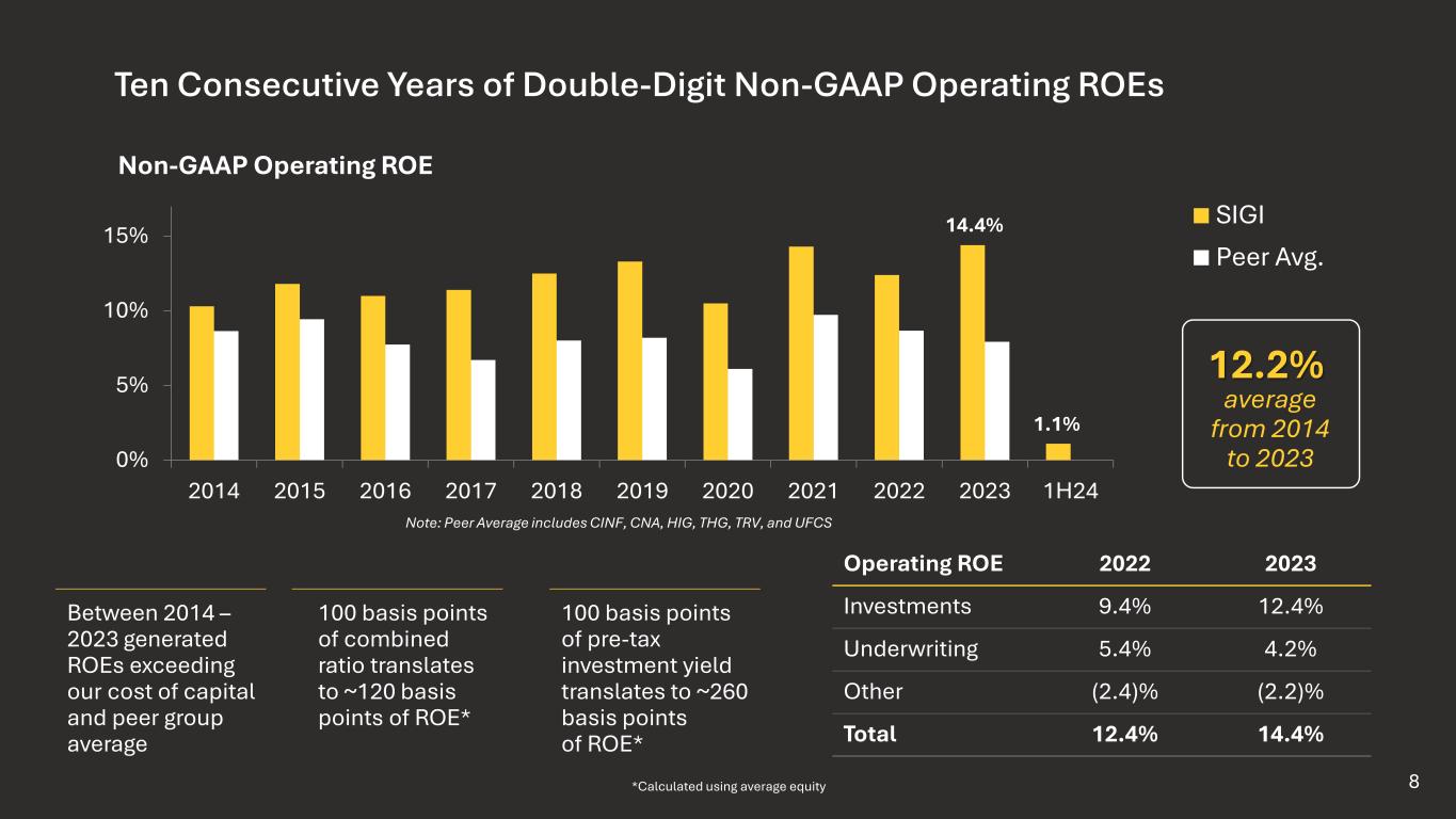 Differentiated Operating Model 7 2023 Net Premiums Written $4 Billion • Approximately 1,550 distribution partners selling our standard lines products and services through approximately 2,650 office locations • ~850 of these distribution partners sell our personal lines products • ~90 wholesale agents sell our E&S business • ~6,400 distribution partners sell National Flood Insurance Program products across 50 states • Locally based underwriting, claims, and safety management specialists • Proven ability to develop and integrate actionable tools • Enables effective portfolio management in an uncertain loss trend environment Unique, locally based field model Franchise value distribution model with high-quality partners "Everyone with Selective makes our customers feel like the #1 priority. The ease of working with Selective is unmatched." - Selective Agent Standard Commercial Lines 79% Standard Personal Lines 10% Excess and Surplus Lines 11%