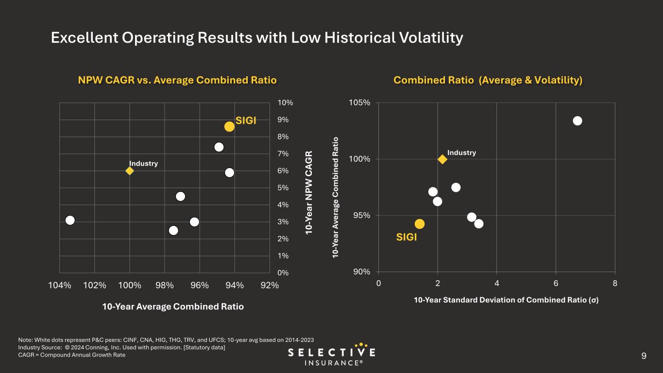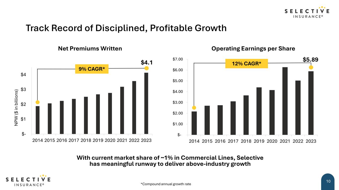 0% 1% 2% 3% 4% 5% 6% 7% 8% 9% 10% 92%94%96%98%100%102%104% 10 -Y ea r N PW C AG R 10-Year Average Combined Ratio Excellent Operating Results with Low Historical Volatility NPW CAGR vs. Average Combined Ratio Note: White dots represent P&C peers: CINF, CNA, HIG, THG, TRV, and UFCS; 10-year avg based on 2014-2023 Industry Source: © 2024 Conning, Inc. Used with permission. [Statutory data] CAGR = Compound Annual Growth Rate SIGI Combined Ratio (Average & Volatility) Industry 90% 95% 100% 105% 0 2 4 6 8 10 -Y ea r A ve ra ge C om bi ne d R at io 10-Year Standard Deviation of Combined Ratio (σ) Industry SIGI 9