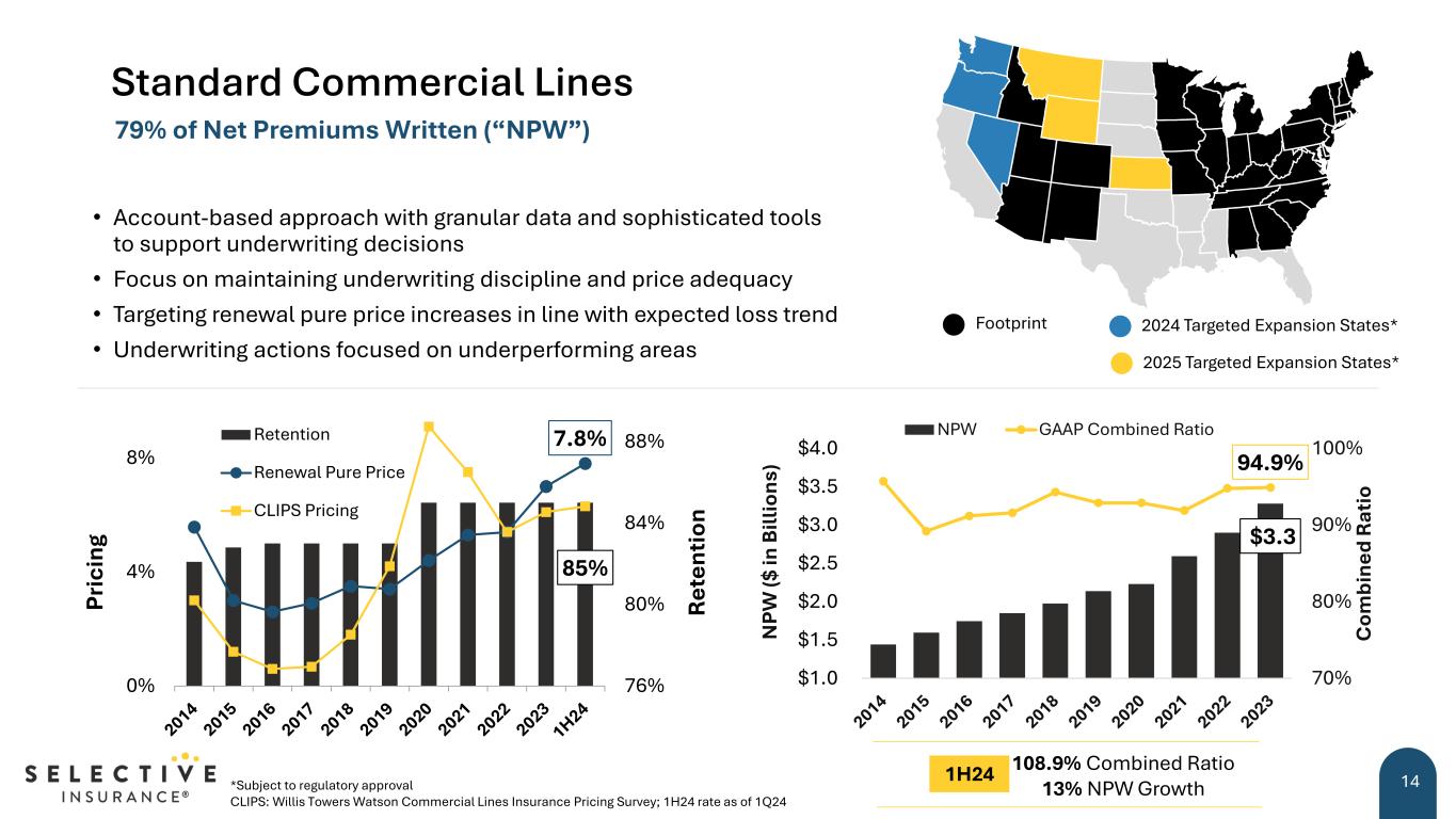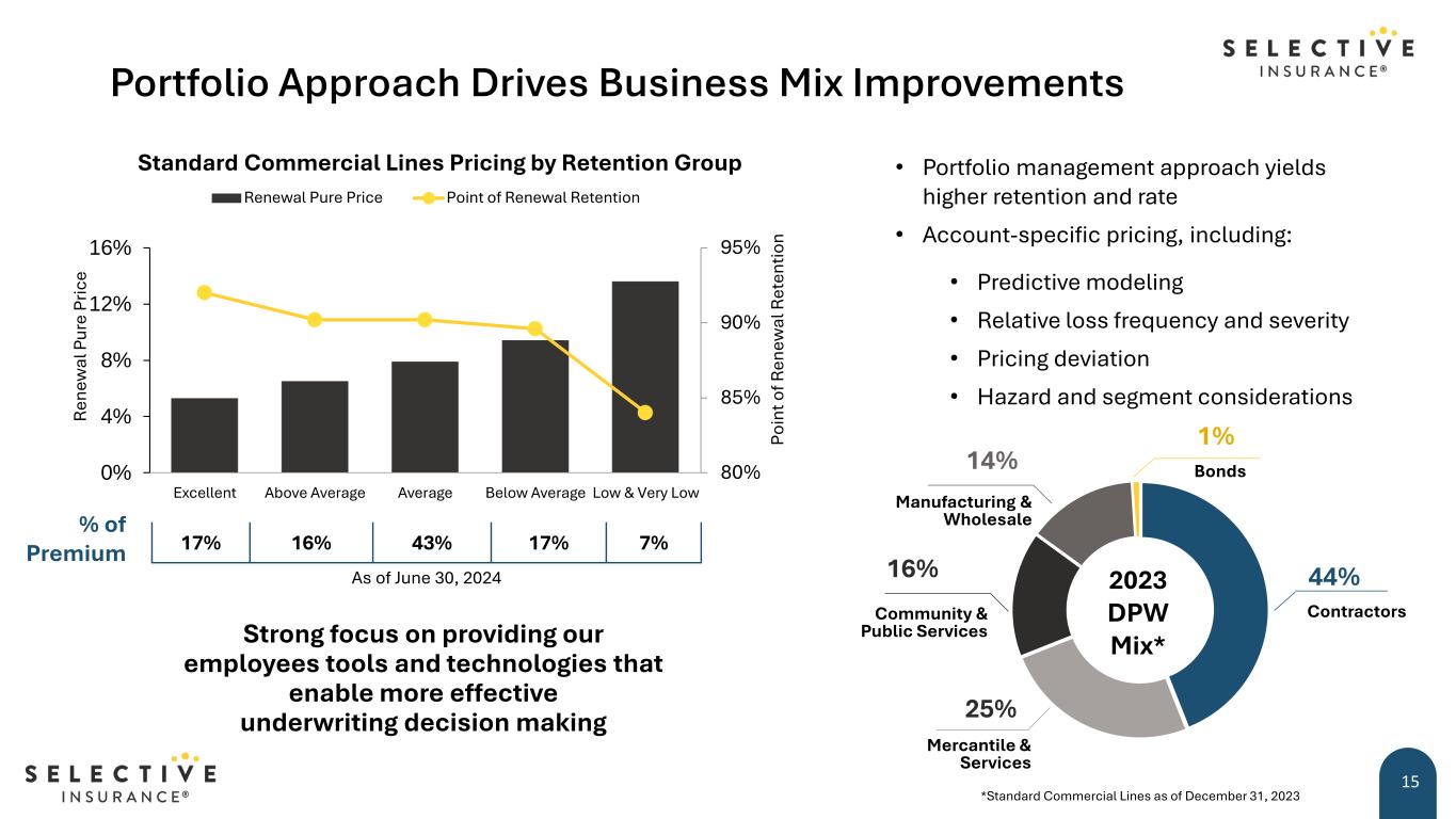 Standard Commercial Lines 14 • Account-based approach with granular data and sophisticated tools to support underwriting decisions • Focus on maintaining underwriting discipline and price adequacy • Targeting renewal pure price increases in line with expected loss trend • Underwriting actions focused on underperforming areas 85% 7.8% 76% 80% 84% 88% 0% 4% 8% R et en ti on Pr ic in g Retention Renewal Pure Price CLIPS Pricing 79% of Net Premiums Written (“NPW”) $3.3 94.9% 70% 80% 90% 100% $1.0 $1.5 $2.0 $2.5 $3.0 $3.5 $4.0 C om bi ne d R at io N PW ($ in B ill io ns ) NPW GAAP Combined Ratio *Subject to regulatory approval CLIPS: Willis Towers Watson Commercial Lines Insurance Pricing Survey; 1H24 rate as of 1Q24 Footprint 2024 Targeted Expansion States* 2025 Targeted Expansion States* 108.9% Combined Ratio 13% NPW Growth 1H24