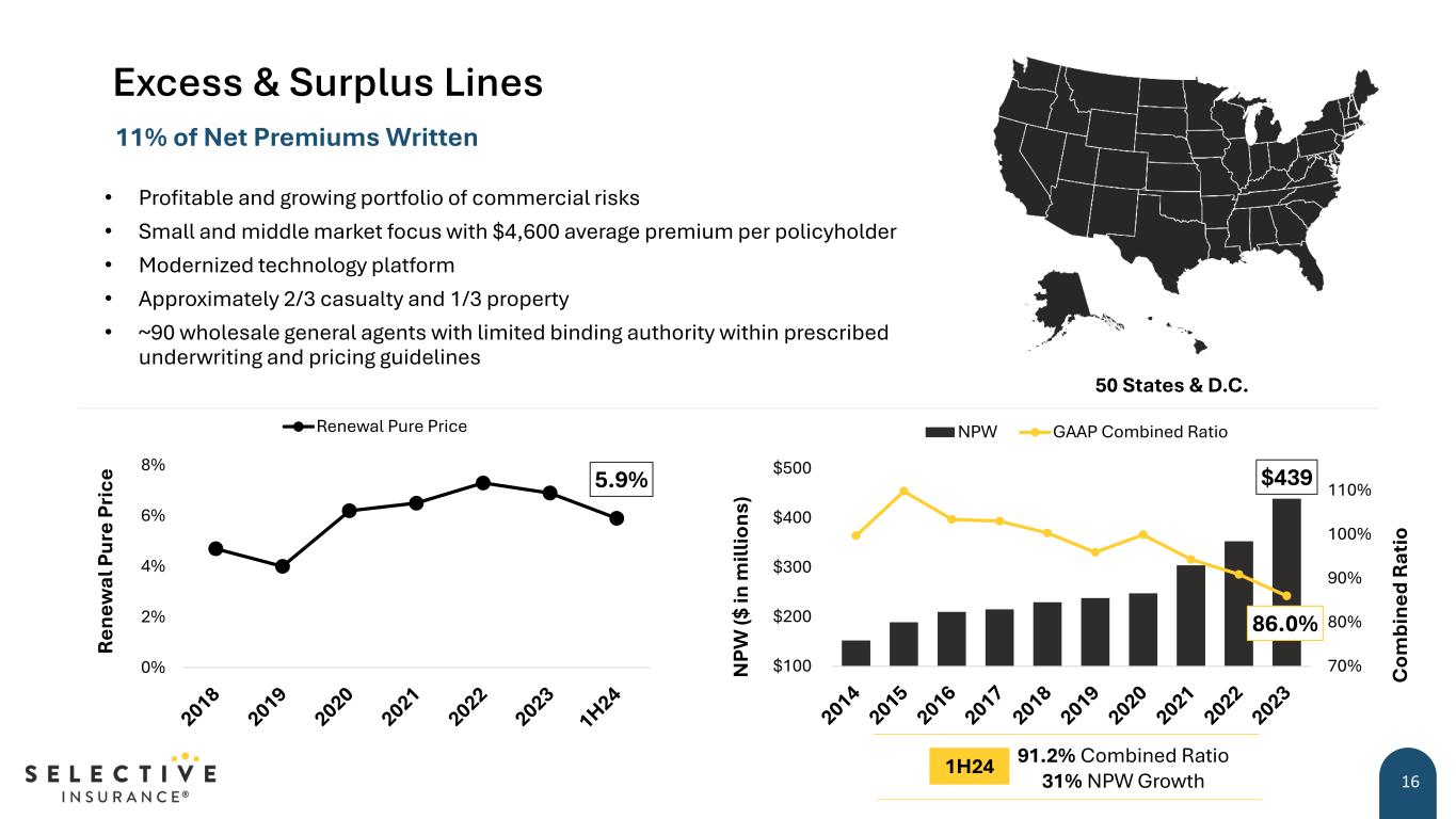 80% 85% 90% 95% 0% 4% 8% 12% 16% Excellent Above Average Average Below Average Low & Very Low Re ne w al P ur e Pr ic e Renewal Pure Price Point of Renewal Retention Po in t o f R en ew al R et en tio n Portfolio Approach Drives Business Mix Improvements 15 • Portfolio management approach yields higher retention and rate • Account-specific pricing, including: • Predictive modeling • Relative loss frequency and severity • Pricing deviation • Hazard and segment considerations Strong focus on providing our employees tools and technologies that enable more effective underwriting decision making Standard Commercial Lines Pricing by Retention Group % of Premium As of June 30, 2024 17% 16% 43% 17% 7% 16% 14% 44% Contractors 1% Bonds Manufacturing & Wholesale Community & Public Services 25% Mercantile & Services 2023 DPW Mix* *Standard Commercial Lines as of December 31, 2023