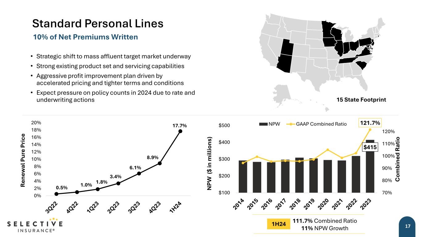 16 Excess & Surplus Lines • Profitable and growing portfolio of commercial risks • Small and middle market focus with $4,600 average premium per policyholder • Modernized technology platform • Approximately 2/3 casualty and 1/3 property • ~90 wholesale general agents with limited binding authority within prescribed underwriting and pricing guidelines $439 86.0% 70% 80% 90% 100% 110% $100 $200 $300 $400 $500 C om bi ne d R at io N PW ($ in m ill io ns ) NPW GAAP Combined Ratio 11% of Net Premiums Written 5.9% 0% 2% 4% 6% 8% R en ew al P ur e Pr ic e Renewal Pure Price 50 States & D.C. 91.2% Combined Ratio 31% NPW Growth 1H24