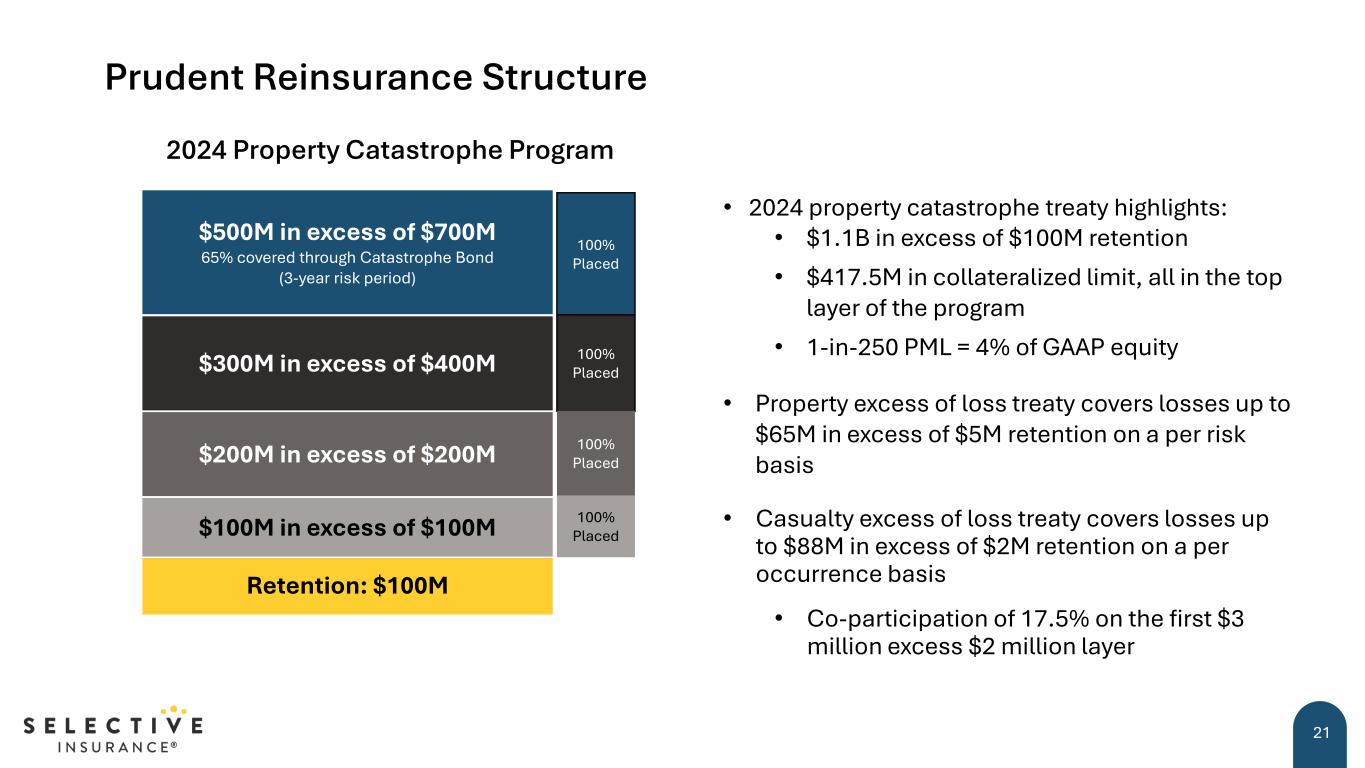 0 2 4 6 8 10 2000 2001 2002 2003 2004 2005 2006 2007 2008 2009 2010 2011 2012 2013 2014 2015 2016 2017 2018 2019 2020 2021 2022 2023 2024F Po in ts o n th e C om bi ne d R at io 6.8% 5.5% Enterprise Risk Management 20 7% 4% 0% 10% 2023 2024 1-in-250 Probable Maximum Loss* as a % of GAAP Equity • Predominantly write low to medium hazard risks • Strong balance sheet and underwriting controls with prudent reserving practices • Catastrophe loss mitigation initiatives include: • Exposure management including strict coastal guidelines • Focus on geographic diversification and growth that minimizes peak peril aggregations • Prudent reinsurance program Impact of Catastrophe Losses on Combined Ratio *Single event hurricane losses are net of reinsurance, after tax, and reinstatement premiums as of 1/1/24; GAAP equity as of 12/31/23 Industry Source: © 2024 AM Best. Used with permission. SIGI Catastrophe Guidance as of July 18, 2024 Average premium per policyholder: Industry Average SIGI $17KStandard Commercial $4.6KExcess & Surplus $3KPersonal Lines
