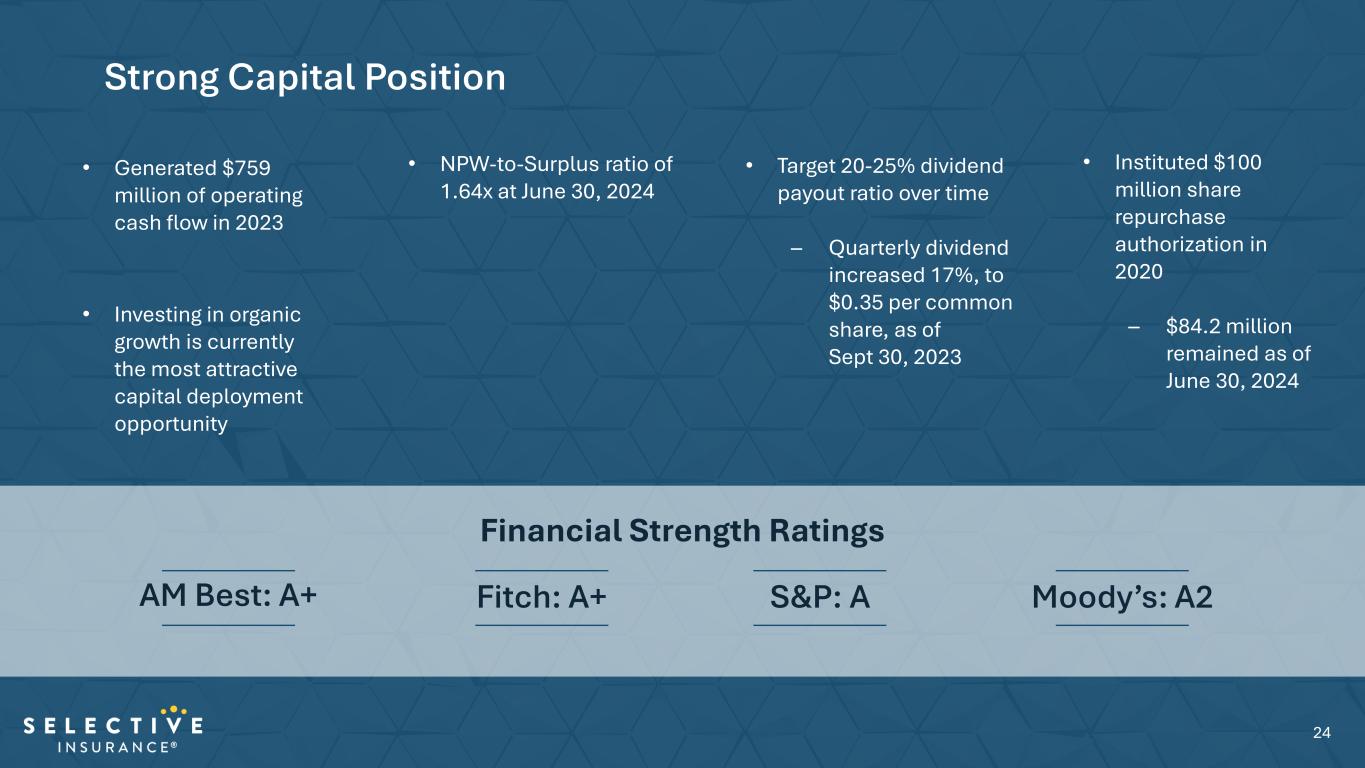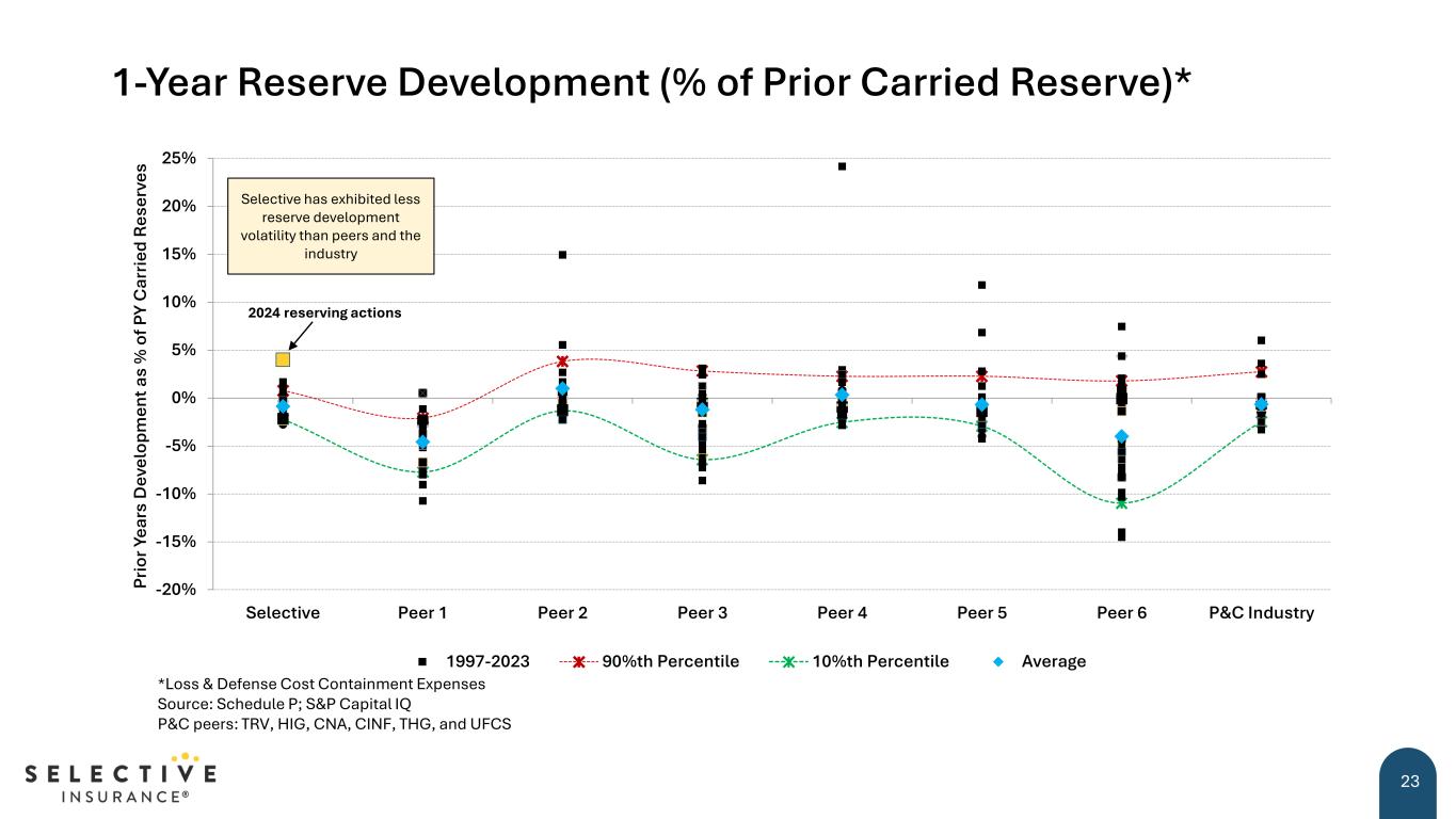 -20% -15% -10% -5% 0% 5% 10% 15% 20% 25% Selective Peer 1 Peer 2 Peer 3 Peer 4 Peer 5 Peer 6 P&C Industry Pr io r Y ea rs D ev el op m en t a s % o f P Y C ar rie d R es er ve s 1997-2023 90%th Percentile 10%th Percentile Average Selective has exhibited less reserve development volatility than peers and the industry 2024 reserving actions 1-Year Reserve Development (% of Prior Carried Reserve)* 23 *Loss & Defense Cost Containment Expenses Source: Schedule P; S&P Capital IQ P&C peers: TRV, HIG, CNA, CINF, THG, and UFCS