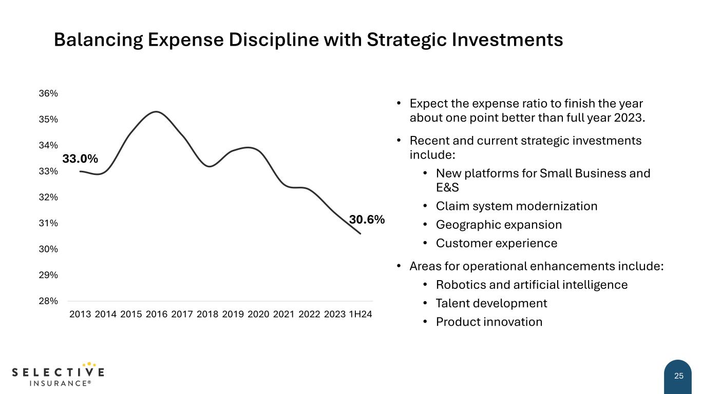 Strong Capital Position 24 • Instituted $100 million share repurchase authorization in 2020 ̶ $84.2 million remained as of June 30, 2024 S&P: A Moody’s: A2Fitch: A+AM Best: A+ Financial Strength Ratings • Generated $759 million of operating cash flow in 2023 • Investing in organic growth is currently the most attractive capital deployment opportunity • NPW-to-Surplus ratio of 1.64x at June 30, 2024 • Target 20-25% dividend payout ratio over time ̶ Quarterly dividend increased 17%, to $0.35 per common share, as of Sept 30, 2023
