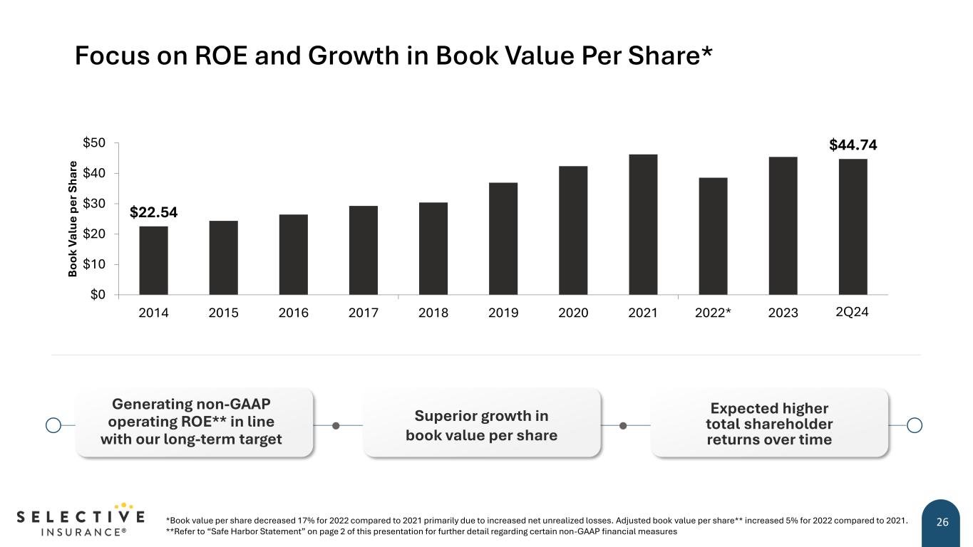 Balancing Expense Discipline with Strategic Investments • Expect the expense ratio to finish the year about one point better than full year 2023. • Recent and current strategic investments include: • New platforms for Small Business and E&S • Claim system modernization • Geographic expansion • Customer experience • Areas for operational enhancements include: • Robotics and artificial intelligence • Talent development • Product innovation 25 33.0% 30.6% 28% 29% 30% 31% 32% 33% 34% 35% 36% 2013 2014 2015 2016 2017 2018 2019 2020 2021 2022 2023 1H24