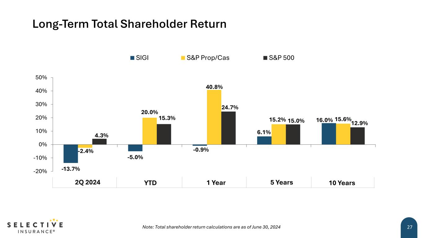 $22.54 $44.74 $0 $10 $20 $30 $40 $50 2014 2015 2016 2017 2018 2019 2020 2021 2022* 2023 B oo k Va lu e pe r S ha re Focus on ROE and Growth in Book Value Per Share* 26*Book value per share decreased 17% for 2022 compared to 2021 primarily due to increased net unrealized losses. Adjusted book value per share** increased 5% for 2022 compared to 2021. **Refer to “Safe Harbor Statement” on page 2 of this presentation for further detail regarding certain non-GAAP financial measures Generating non-GAAP operating ROE** in line with our long-term target Superior growth in book value per share Expected higher total shareholder returns over time 2Q24