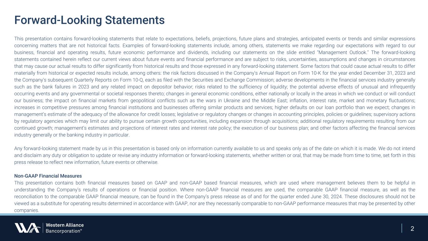 2 This presentation contains forward-looking statements that relate to expectations, beliefs, projections, future plans and strategies, anticipated events or trends and similar expressions concerning matters that are not historical facts. Examples of forward-looking statements include, among others, statements we make regarding our expectations with regard to our business, financial and operating results, future economic performance and dividends, including our statements on the slide entitled "Management Outlook." The forward-looking statements contained herein reflect our current views about future events and financial performance and are subject to risks, uncertainties, assumptions and changes in circumstances that may cause our actual results to differ significantly from historical results and those expressed in any forward-looking statement. Some factors that could cause actual results to differ materially from historical or expected results include, among others: the risk factors discussed in the Company’s Annual Report on Form 10-K for the year ended December 31, 2023 and the Company's subsequent Quarterly Reports on Form 10-Q, each as filed with the Securities and Exchange Commission; adverse developments in the financial services industry generally such as the bank failures in 2023 and any related impact on depositor behavior; risks related to the sufficiency of liquidity; the potential adverse effects of unusual and infrequently occurring events and any governmental or societal responses thereto; changes in general economic conditions, either nationally or locally in the areas in which we conduct or will conduct our business; the impact on financial markets from geopolitical conflicts such as the wars in Ukraine and the Middle East; inflation, interest rate, market and monetary fluctuations; increases in competitive pressures among financial institutions and businesses offering similar products and services; higher defaults on our loan portfolio than we expect; changes in management’s estimate of the adequacy of the allowance for credit losses; legislative or regulatory changes or changes in accounting principles, policies or guidelines; supervisory actions by regulatory agencies which may limit our ability to pursue certain growth opportunities, including expansion through acquisitions; additional regulatory requirements resulting from our continued growth; management’s estimates and projections of interest rates and interest rate policy; the execution of our business plan; and other factors affecting the financial services industry generally or the banking industry in particular. Any forward-looking statement made by us in this presentation is based only on information currently available to us and speaks only as of the date on which it is made. We do not intend and disclaim any duty or obligation to update or revise any industry information or forward-looking statements, whether written or oral, that may be made from time to time, set forth in this press release to reflect new information, future events or otherwise. Non-GAAP Financial Measures This presentation contains both financial measures based on GAAP and non-GAAP based financial measures, which are used where management believes them to be helpful in understanding the Company’s results of operations or financial position. Where non-GAAP financial measures are used, the comparable GAAP financial measure, as well as the reconciliation to the comparable GAAP financial measure, can be found in the Company’s press release as of and for the quarter ended June 30, 2024. These disclosures should not be viewed as a substitute for operating results determined in accordance with GAAP, nor are they necessarily comparable to non-GAAP performance measures that may be presented by other companies. Forward-Looking Statements