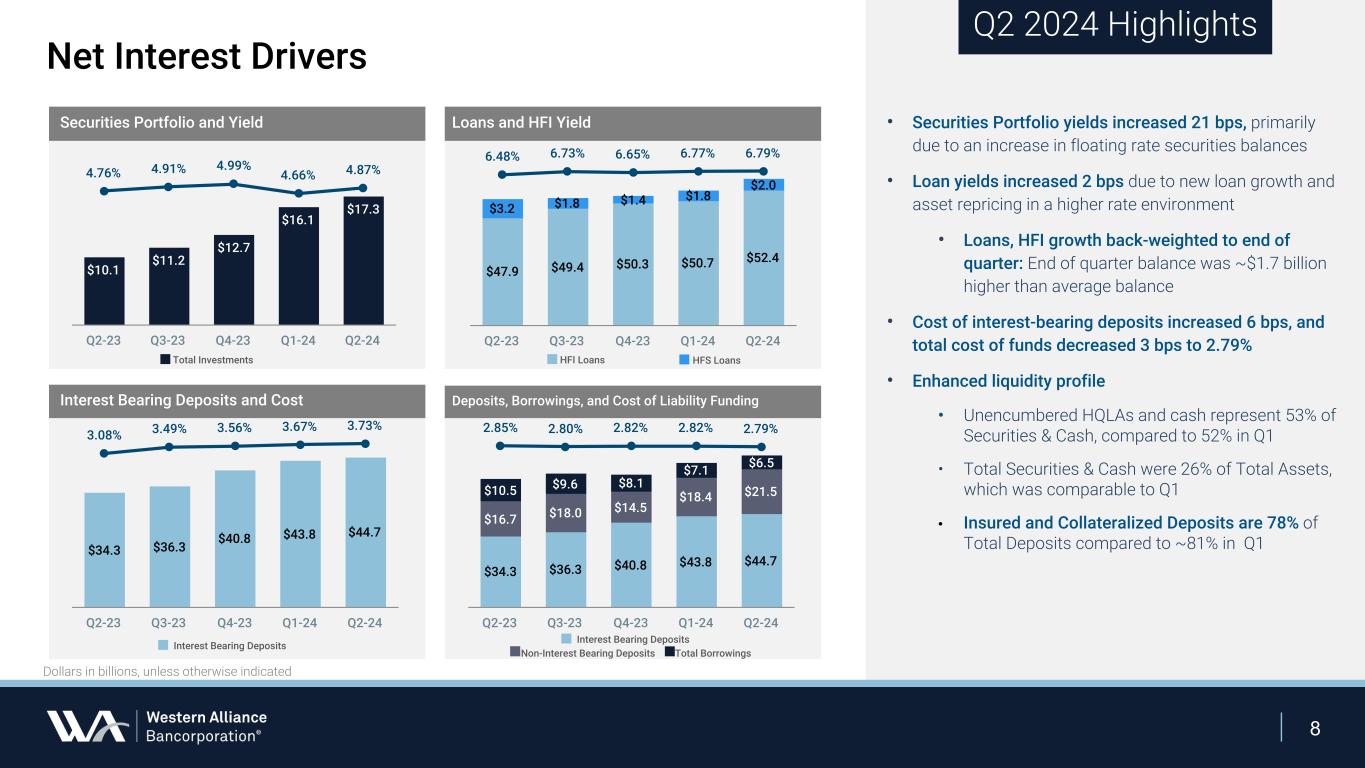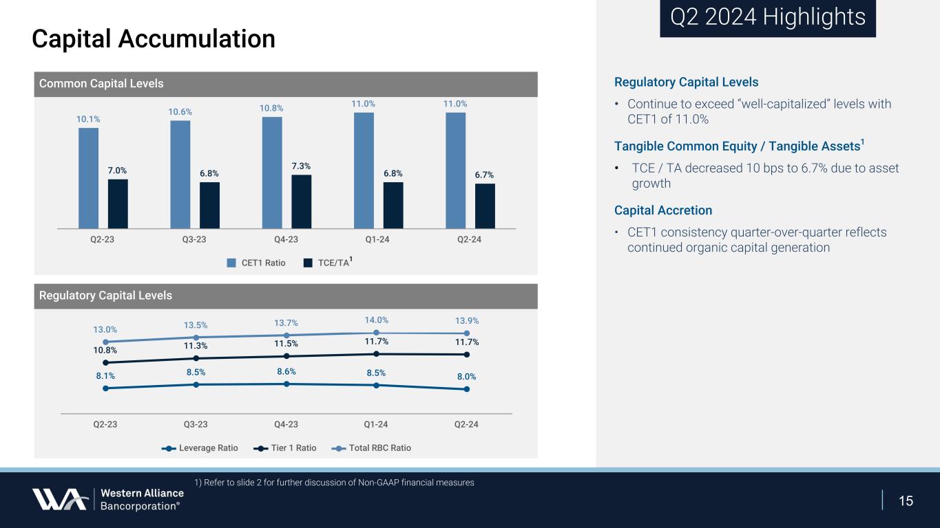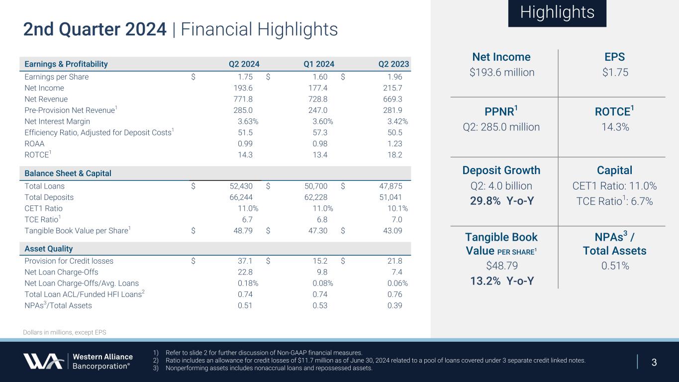 “Western Alliance delivered strong second quarter results featuring robust net interest income growth, gathering loan momentum, and sustained deposit generation,” said Kenneth A. Vecchione, President and Chief Executive Officer. “With balance sheet repositioning actions completed, our focus is rededicated to generating safe, sound risk-adjusted growth supported by an enhanced liquidity profile and sturdy capital base. We achieved net income of $193.6 million and earnings per share of $1.75 for the second quarter 2024, which resulted in a return on tangible common equity1 of 14.3%. Capital generation continued to improve as pre-provision net revenue1 grew 22% linked quarter annualized excluding the impact of the FDIC special assessment. Tangible book value per share1 climbed 13.2% year-over-year to $48.79 with a CET1 ratio of 11.0%.” |
