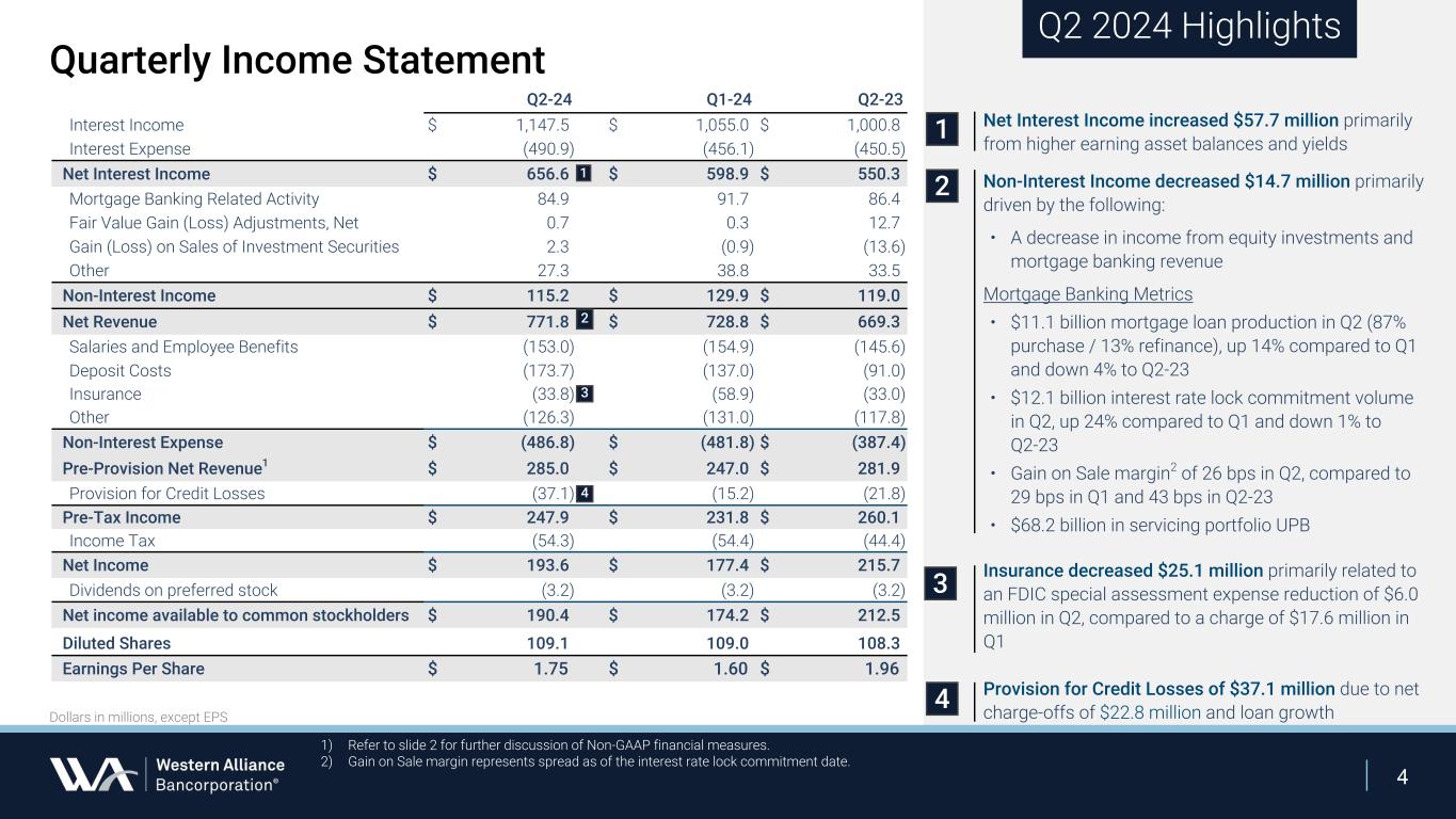 3 2nd Quarter 2024 | Financial Highlights Earnings & Profitability Q2 2024 Q1 2024 Q2 2023 Earnings per Share $ 1.75 $ 1.60 $ 1.96 Net Income 193.6 177.4 215.7 Net Revenue 771.8 728.8 669.3 Pre-Provision Net Revenue1 285.0 247.0 281.9 Net Interest Margin 3.63% 3.60% 3.42% Efficiency Ratio, Adjusted for Deposit Costs1 51.5 57.3 50.5 ROAA 0.99 0.98 1.23 ROTCE1 14.3 13.4 18.2 Balance Sheet & Capital Total Loans $ 52,430 $ 50,700 $ 47,875 Total Deposits 66,244 62,228 51,041 CET1 Ratio 11.0% 11.0% 10.1% TCE Ratio1 6.7 6.8 7.0 Tangible Book Value per Share1 $ 48.79 $ 47.30 $ 43.09 Asset Quality Provision for Credit losses $ 37.1 $ 15.2 $ 21.8 Net Loan Charge-Offs 22.8 9.8 7.4 Net Loan Charge-Offs/Avg. Loans 0.18% 0.08% 0.06% Total Loan ACL/Funded HFI Loans2 0.74 0.74 0.76 NPAs3/Total Assets 0.51 0.53 0.39 Dollars in millions, except EPS Net Income EPS $193.6 million $1.75 PPNR1 ROTCE1 Q2: 285.0 million 14.3% Deposit Growth Capital Q2: 4.0 billion CET1 Ratio: 11.0% 29.8% Y-o-Y TCE Ratio1: 6.7% Tangible Book Value PER SHARE1 NPAs3 / Total Assets $48.79 0.51% 13.2% Y-o-Y 1) Refer to slide 2 for further discussion of Non-GAAP financial measures. 2) Ratio includes an allowance for credit losses of $11.7 million as of June 30, 2024 related to a pool of loans covered under 3 separate credit linked notes. 3) Nonperforming assets includes nonaccrual loans and repossessed assets. Highlights