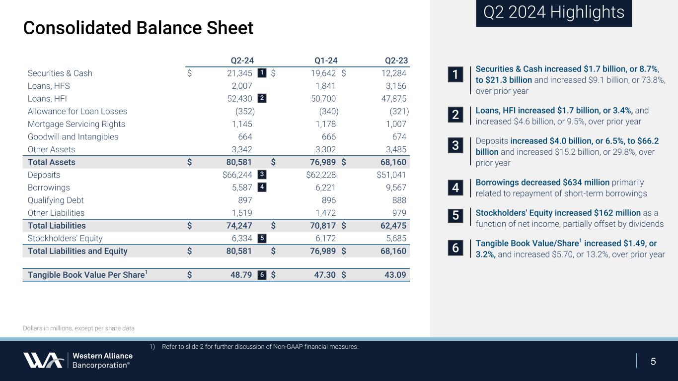 4 Q2-24 Q1-24 Q2-23 Interest Income $ 1,147.5 $ 1,055.0 $ 1,000.8 Interest Expense (490.9) (456.1) (450.5) Net Interest Income $ 656.6 $ 598.9 $ 550.3 Mortgage Banking Related Activity 84.9 91.7 86.4 Fair Value Gain (Loss) Adjustments, Net 0.7 0.3 12.7 Gain (Loss) on Sales of Investment Securities 2.3 (0.9) (13.6) Other 27.3 38.8 33.5 Non-Interest Income $ 115.2 $ 129.9 $ 119.0 Net Revenue $ 771.8 $ 728.8 $ 669.3 Salaries and Employee Benefits (153.0) (154.9) (145.6) Deposit Costs (173.7) (137.0) (91.0) Insurance (33.8) (58.9) (33.0) Other (126.3) (131.0) (117.8) Non-Interest Expense $ (486.8) $ (481.8) $ (387.4) Pre-Provision Net Revenue1 $ 285.0 $ 247.0 $ 281.9 Provision for Credit Losses (37.1) (15.2) (21.8) Pre-Tax Income $ 247.9 $ 231.8 $ 260.1 Income Tax (54.3) (54.4) (44.4) Net Income $ 193.6 $ 177.4 $ 215.7 Dividends on preferred stock (3.2) (3.2) (3.2) Net income available to common stockholders $ 190.4 $ 174.2 $ 212.5 Diluted Shares 109.1 109.0 108.3 Earnings Per Share $ 1.75 $ 1.60 $ 1.96 1) Refer to slide 2 for further discussion of Non-GAAP financial measures. 2) Gain on Sale margin represents spread as of the interest rate lock commitment date. Quarterly Income Statement Q2 2024 Highlights 1 2 3 4 Net Interest Income increased $57.7 million primarily from higher earning asset balances and yields Non-Interest Income decreased $14.7 million primarily driven by the following: • A decrease in income from equity investments and mortgage banking revenue Mortgage Banking Metrics • $11.1 billion mortgage loan production in Q2 (87% purchase / 13% refinance), up 14% compared to Q1 and down 4% to Q2-23 • $12.1 billion interest rate lock commitment volume in Q2, up 24% compared to Q1 and down 1% to Q2-23 • Gain on Sale margin2 of 26 bps in Q2, compared to 29 bps in Q1 and 43 bps in Q2-23 • $68.2 billion in servicing portfolio UPB Insurance decreased $25.1 million primarily related to an FDIC special assessment expense reduction of $6.0 million in Q2, compared to a charge of $17.6 million in Q1 Provision for Credit Losses of $37.1 million due to net charge-offs of $22.8 million and loan growth 1 2 3 4 Dollars in millions, except EPS