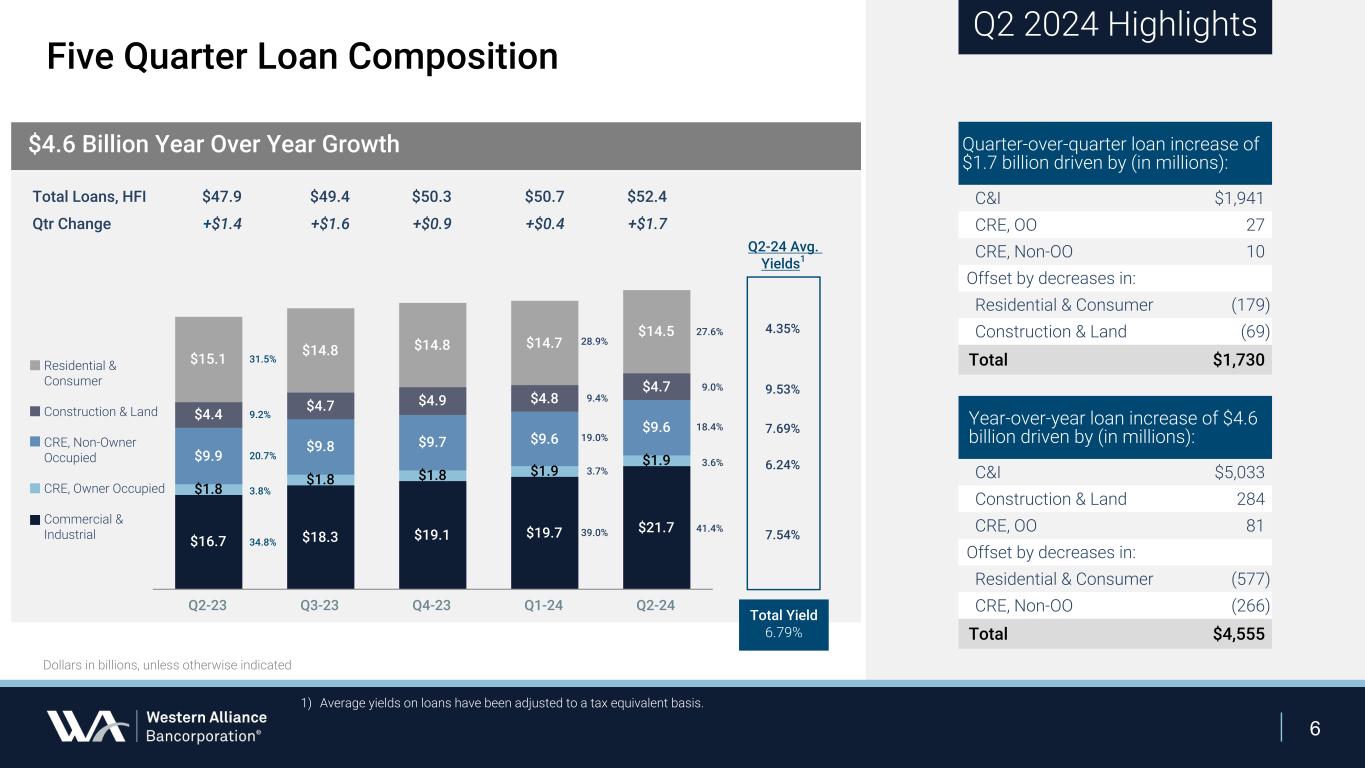 5 Q2-24 Q1-24 Q2-23 Securities & Cash $ 21,345 $ 19,642 $ 12,284 Loans, HFS 2,007 1,841 3,156 Loans, HFI 52,430 50,700 47,875 Allowance for Loan Losses (352) (340) (321) Mortgage Servicing Rights 1,145 1,178 1,007 Goodwill and Intangibles 664 666 674 Other Assets 3,342 3,302 3,485 Total Assets $ 80,581 $ 76,989 $ 68,160 Deposits $66,244 $62,228 $51,041 Borrowings 5,587 6,221 9,567 Qualifying Debt 897 896 888 Other Liabilities 1,519 1,472 979 Total Liabilities $ 74,247 $ 70,817 $ 62,475 Stockholders' Equity 6,334 6,172 5,685 Total Liabilities and Equity $ 80,581 $ 76,989 $ 68,160 Tangible Book Value Per Share1 $ 48.79 $ 47.30 $ 43.09 Dollars in millions, except per share data Consolidated Balance Sheet Q2 2024 Highlights 1 2 3 4 5 Securities & Cash increased $1.7 billion, or 8.7%, to $21.3 billion and increased $9.1 billion, or 73.8%, over prior year Loans, HFI increased $1.7 billion, or 3.4%, and increased $4.6 billion, or 9.5%, over prior year Deposits increased $4.0 billion, or 6.5%, to $66.2 billion and increased $15.2 billion, or 29.8%, over prior year Borrowings decreased $634 million primarily related to repayment of short-term borrowings Stockholders' Equity increased $162 million as a function of net income, partially offset by dividends Tangible Book Value/Share1 increased $1.49, or 3.2%, and increased $5.70, or 13.2%, over prior year 1) Refer to slide 2 for further discussion of Non-GAAP financial measures. 6 1 2 3 4 5 6