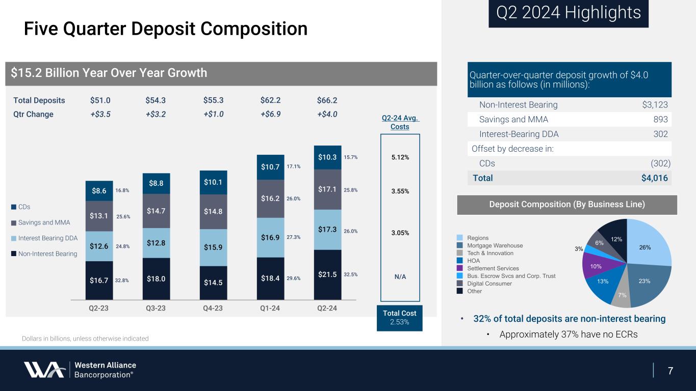 6 $4.6 Billion Year Over Year Growth $16.7 $18.3 $19.1 $19.7 $21.7 $1.8 $1.8 $1.8 $1.9 $1.9$9.9 $9.8 $9.7 $9.6 $9.6 $4.4 $4.7 $4.9 $4.8 $4.7 $15.1 $14.8 $14.8 $14.7 $14.5 Q2-23 Q3-23 Q4-23 Q1-24 Q2-24 31.5% 3.8% 20.7% 34.8% 9.2% 27.6% 3.6% 18.4% 41.4% 9.0% Residential & Consumer Construction & Land CRE, Non-Owner Occupied CRE, Owner Occupied Commercial & Industrial $47.9 +$1.4 $49.4 +$1.6 $50.3 +$0.9 $50.7 +$0.4 $52.4 +$1.7 Dollars in billions, unless otherwise indicated Total Loans, HFI Qtr Change Five Quarter Loan Composition Q2 2024 Highlights Quarter-over-quarter loan increase of $1.7 billion driven by (in millions): C&I $1,941 CRE, OO 27 CRE, Non-OO 10 Offset by decreases in: Residential & Consumer (179) Construction & Land (69) Total $1,730 Year-over-year loan increase of $4.6 billion driven by (in millions): C&I $5,033 Construction & Land 284 CRE, OO 81 Offset by decreases in: Residential & Consumer (577) CRE, Non-OO (266) Total $4,555 28.9% 3.7% 19.0% 39.0% 9.4% 4.35% 6.24% 7.69% 7.54% 9.53% Q2-24 Avg. Yields1 Total Yield 6.79% 1) Average yields on loans have been adjusted to a tax equivalent basis.