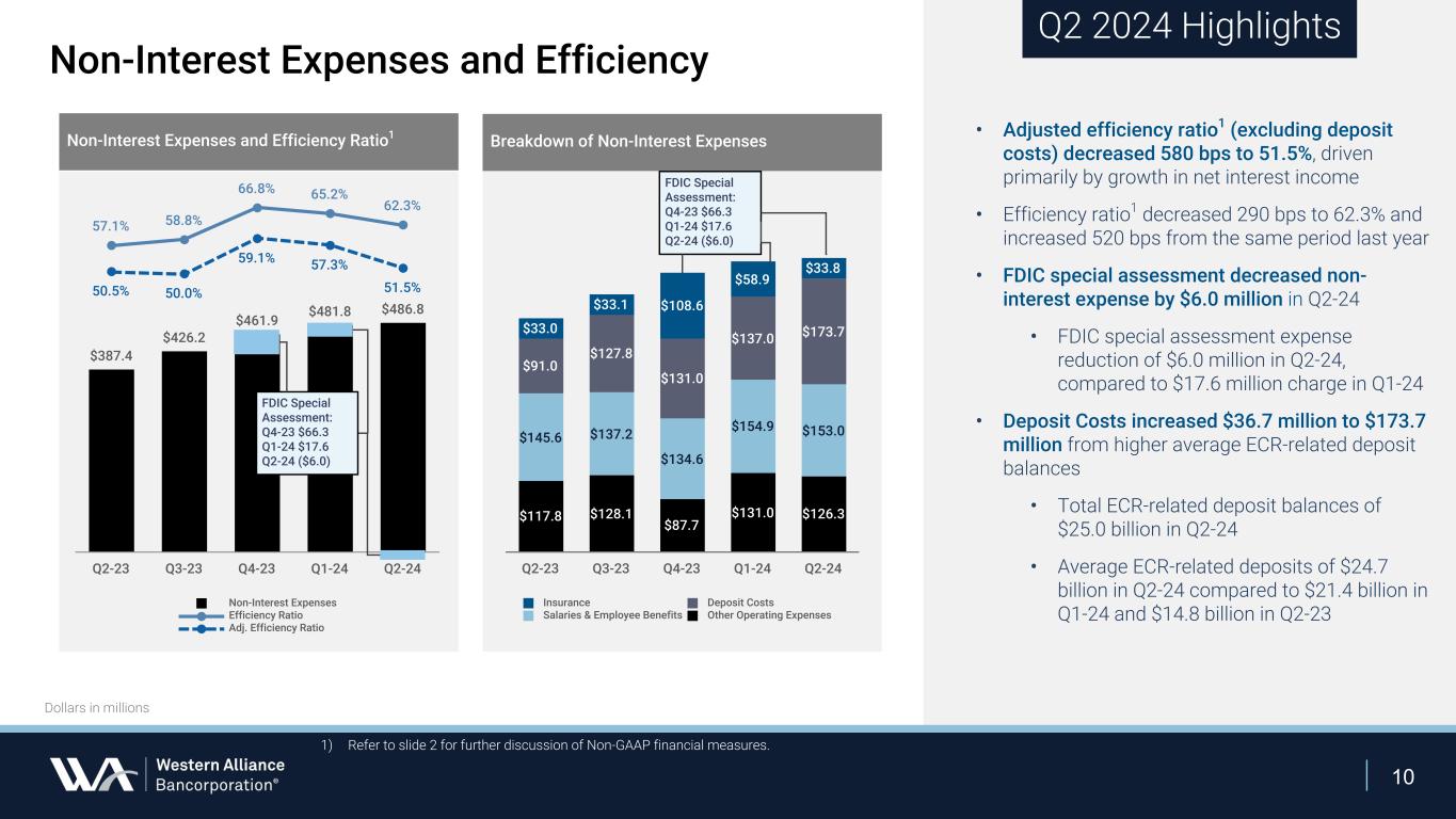 9 Net Interest Income and Net Interest Margin $550.3 $587.0 $591.7 $598.9 $656.6 3.42% 3.67% 3.65% 3.60% 3.63% Net Interest Margin Net Interest Income Q2-23 Q3-23 Q4-23 Q1-24 Q2-24 $65.6 $64.5 $65.3 $68.0 $73.8 $46.8 $48.1 $49.6 $49.7 $50.8 $6.3 $3.1 $1.8 $2.4 $2.9 $9.9 $10.4 $11.3 $12.9 $16.2 $2.6 $2.9 $2.6 $3.0 $4.0 6.17% 6.37% 6.37% 6.29% 6.30% Loans Loans HFS Securities Cash & Other Average Yield Q2-23 Q3-23 Q4-23 Q1-24 Q2-24 Average Earning Assets & Average Yield Dollars in millions Dollars in billions Net Interest Income Q2 2024 Highlights 4% 15% 10% 4% 19% 4% 5% 22% 4% 71% 73% 69% • Net Interest Income increased $57.7 million, or 9.6%, primarily due to a higher average earning assets balance and lower cost of liability funding • NIM increased 3 bps, driven by the growth in average earning assets outpacing interest-bearing deposits • Yield on Average Earning Assets increased 1 bp to 6.30% due to earning asset mix shift into higher-yielding securities and loan growth • Average Earning Assets grew $5.9 billion, or 8.6%, primarily deployed into securities and HFI loans 9