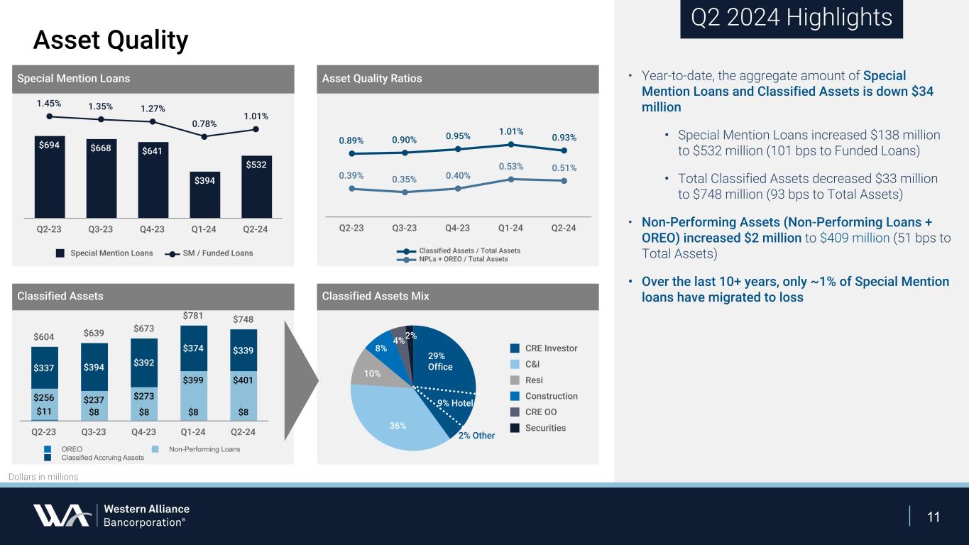 10 • Adjusted efficiency ratio1 (excluding deposit costs) decreased 580 bps to 51.5%, driven primarily by growth in net interest income • Efficiency ratio1 decreased 290 bps to 62.3% and increased 520 bps from the same period last year • FDIC special assessment decreased non- interest expense by $6.0 million in Q2-24 • FDIC special assessment expense reduction of $6.0 million in Q2-24, compared to $17.6 million charge in Q1-24 • Deposit Costs increased $36.7 million to $173.7 million from higher average ECR-related deposit balances • Total ECR-related deposit balances of $25.0 billion in Q2-24 • Average ECR-related deposits of $24.7 billion in Q2-24 compared to $21.4 billion in Q1-24 and $14.8 billion in Q2-23 $387.4 $426.2 $461.9 $481.8 $486.8 57.1% 58.8% 66.8% 65.2% 62.3% 50.5% 50.0% 59.1% 57.3% 51.5% Non-Interest Expenses Efficiency Ratio Adj. Efficiency Ratio Q2-23 Q3-23 Q4-23 Q1-24 Q2-24 Dollars in millions $117.8 $128.1 $87.7 $131.0 $126.3 $145.6 $137.2 $134.6 $154.9 $153.0 $91.0 $127.8 $131.0 $137.0 $173.7$33.0 $33.1 $108.6 $58.9 $33.8 Insurance Deposit Costs Salaries & Employee Benefits Other Operating Expenses Q2-23 Q3-23 Q4-23 Q1-24 Q2-24 Non-Interest Expenses and Efficiency Q2 2024 Highlights Non-Interest Expenses and Efficiency Ratio1 Breakdown of Non-Interest Expenses FDIC Special Assessment: Q4-23 $66.3 Q1-24 $17.6 Q2-24 ($6.0) 1) Refer to slide 2 for further discussion of Non-GAAP financial measures. FDIC Special Assessment: Q4-23 $66.3 Q1-24 $17.6 Q2-24 ($6.0)