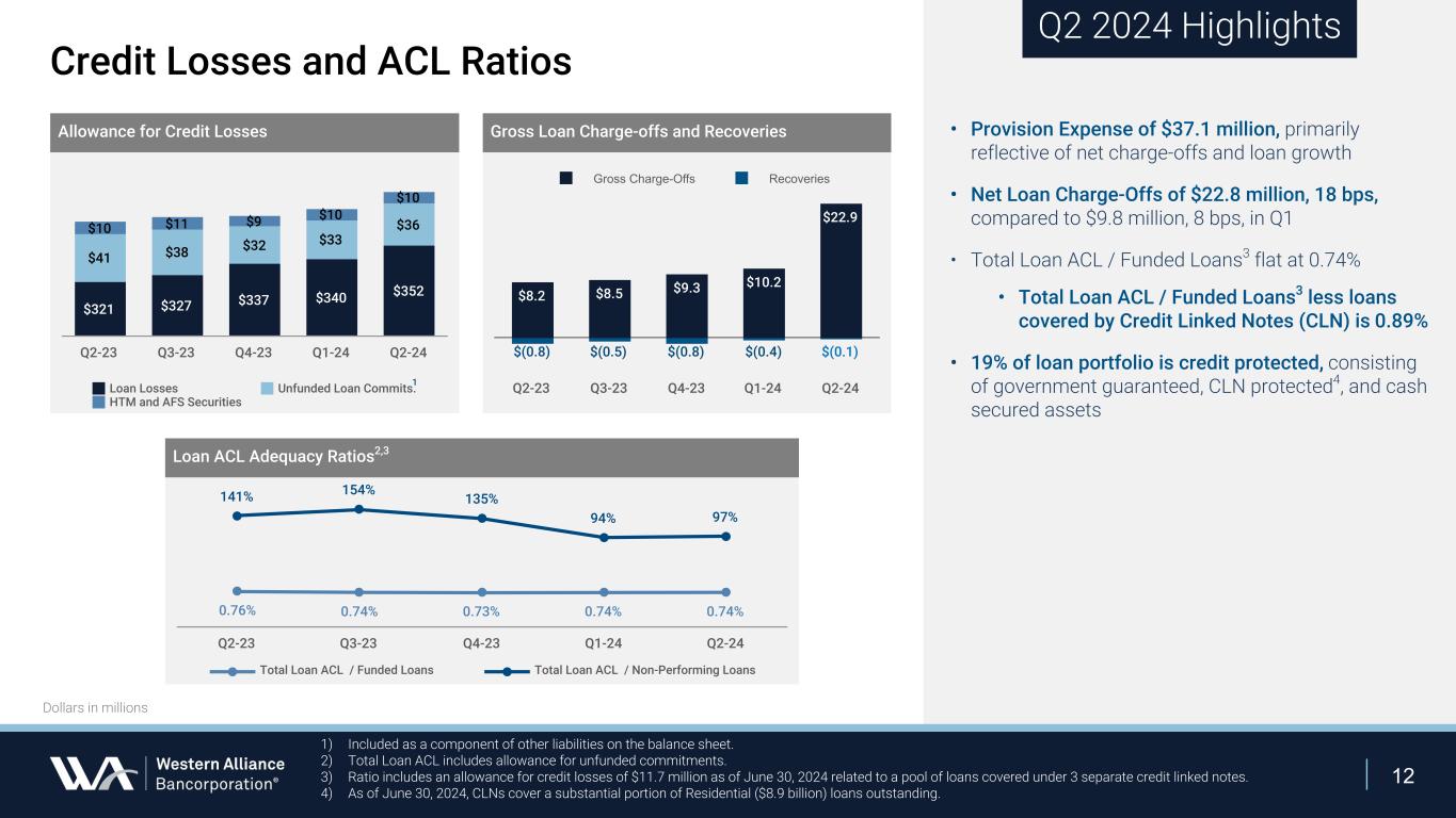 11 0.89% 0.90% 0.95% 1.01% 0.93% 0.39% 0.35% 0.40% 0.53% 0.51% Classified Assets / Total Assets NPLs + OREO / Total Assets Q2-23 Q3-23 Q4-23 Q1-24 Q2-24 $604 $639 $673 $781 $748 $11 $8 $8 $8 $8 $256 $237 $273 $399 $401 $337 $394 $392 $374 $339 OREO Non-Performing Loans Classified Accruing Assets Q2-23 Q3-23 Q4-23 Q1-24 Q2-24 Dollars in millions Asset Quality RatiosSpecial Mention Loans • Year-to-date, the aggregate amount of Special Mention Loans and Classified Assets is down $34 million • Special Mention Loans increased $138 million to $532 million (101 bps to Funded Loans) • Total Classified Assets decreased $33 million to $748 million (93 bps to Total Assets) • Non-Performing Assets (Non-Performing Loans + OREO) increased $2 million to $409 million (51 bps to Total Assets) • Over the last 10+ years, only ~1% of Special Mention loans have migrated to lossClassified Assets $694 $668 $641 $394 $532 1.45% 1.35% 1.27% 0.78% 1.01% Special Mention Loans SM / Funded Loans Q2-23 Q3-23 Q4-23 Q1-24 Q2-24 Q2 2024 Highlights Classified Assets Mix 36% 10% 8% 4%2% CRE Investor C&I Resi Construction CRE OO Securities 2% Other 29% Office 9% Hotel Asset Quality