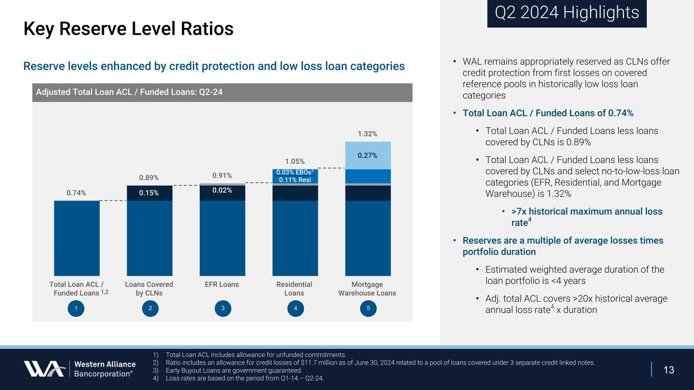 12 $8.2 $8.5 $9.3 $10.2 $22.9 $(0.8) $(0.5) $(0.8) $(0.4) $(0.1) Gross Charge-Offs Recoveries Q2-23 Q3-23 Q4-23 Q1-24 Q2-24 $321 $327 $337 $340 $352 $41 $38 $32 $33 $36$10 $11 $9 $10 $10 Loan Losses Unfunded Loan Commits. HTM and AFS Securities Q2-23 Q3-23 Q4-23 Q1-24 Q2-24 0.76% 0.74% 0.73% 0.74% 0.74% 141% 154% 135% 94% 97% Total Loan ACL / Funded Loans Total Loan ACL / Non-Performing Loans Q2-23 Q3-23 Q4-23 Q1-24 Q2-24 Dollars in millions • Provision Expense of $37.1 million, primarily reflective of net charge-offs and loan growth • Net Loan Charge-Offs of $22.8 million, 18 bps, compared to $9.8 million, 8 bps, in Q1 • Total Loan ACL / Funded Loans3 flat at 0.74% • Total Loan ACL / Funded Loans3 less loans covered by Credit Linked Notes (CLN) is 0.89% • 19% of loan portfolio is credit protected, consisting of government guaranteed, CLN protected4, and cash secured assets Credit Losses and ACL Ratios Q2 2024 Highlights Gross Loan Charge-offs and RecoveriesAllowance for Credit Losses Loan ACL Adequacy Ratios2,3 1) Included as a component of other liabilities on the balance sheet. 2) Total Loan ACL includes allowance for unfunded commitments. 3) Ratio includes an allowance for credit losses of $11.7 million as of June 30, 2024 related to a pool of loans covered under 3 separate credit linked notes. 4) As of June 30, 2024, CLNs cover a substantial portion of Residential ($8.9 billion) loans outstanding. 1