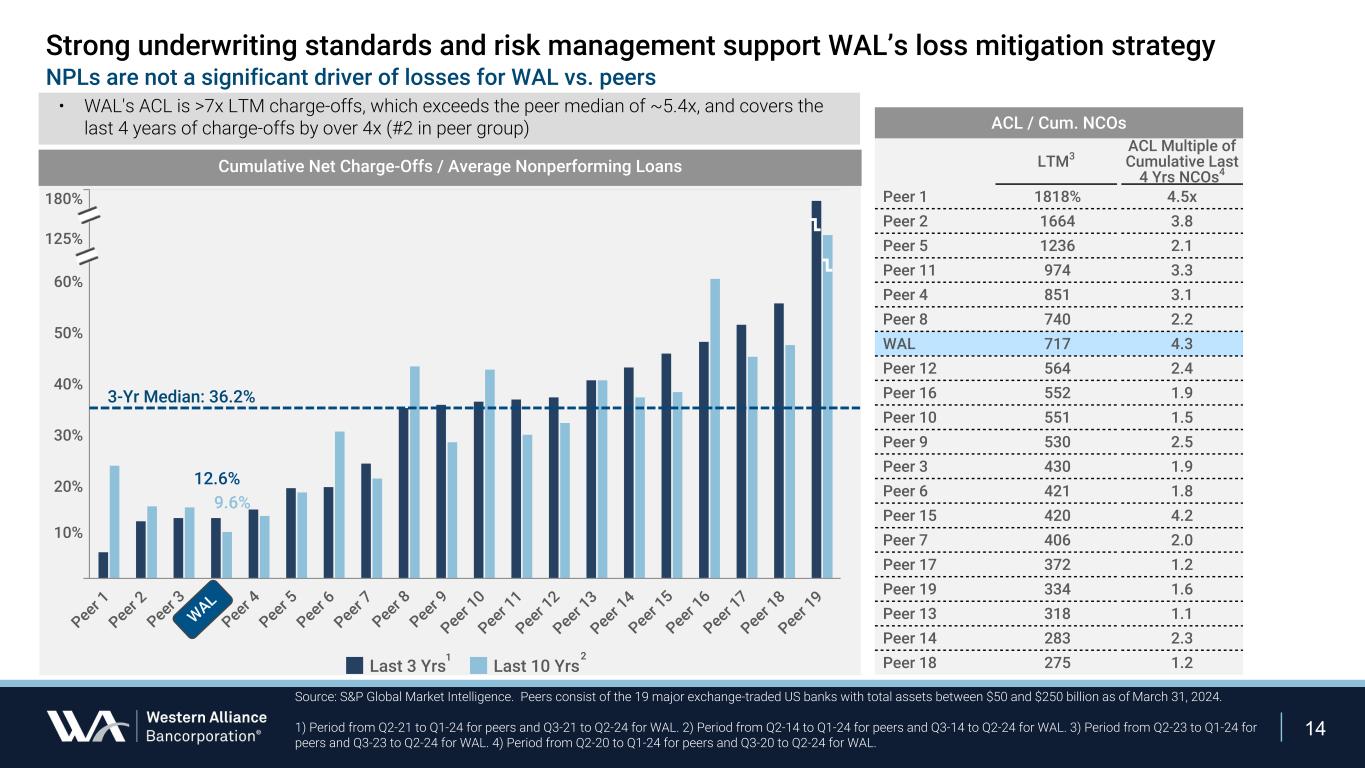 14 Strong underwriting standards and risk management support WAL’s loss mitigation strategy NPLs are not a significant driver of losses for WAL vs. peers Source: S&P Global Market Intelligence. Peers consist of the 19 major exchange-traded US banks with total assets between $50 and $250 billion as of March 31, 2024. 1) Period from Q2-21 to Q1-24 for peers and Q3-21 to Q2-24 for WAL. 2) Period from Q2-14 to Q1-24 for peers and Q3-14 to Q2-24 for WAL. 3) Period from Q2-23 to Q1-24 for peers and Q3-23 to Q2-24 for WAL. 4) Period from Q2-20 to Q1-24 for peers and Q3-20 to Q2-24 for WAL. Last 3 Yrs Last 10 Yrs Peer 1 Peer 2 Peer 3 Peer 4 Peer 5 Peer 6 Peer 7 Peer 8 Peer 9 Peer 1 0 Peer 1 1 Peer 1 2 Peer 1 3 Peer 1 4 Peer 1 5 Peer 1 6 Peer 1 7 Peer 1 8 Peer 1 9 WAL 180% Cumulative Net Charge-Offs / Average Nonperforming Loans ACL / Cum. NCOs LTM3 ACL Multiple of Cumulative Last 4 Yrs NCOs4 Peer 1 1818% 4.5x Peer 2 1664 3.8 Peer 5 1236 2.1 Peer 11 974 3.3 Peer 4 851 3.1 Peer 8 740 2.2 WAL 717 4.3 Peer 12 564 2.4 Peer 16 552 1.9 Peer 10 551 1.5 Peer 9 530 2.5 Peer 3 430 1.9 Peer 6 421 1.8 Peer 15 420 4.2 Peer 7 406 2.0 Peer 17 372 1.2 Peer 19 334 1.6 Peer 13 318 1.1 Peer 14 283 2.3 Peer 18 275 1.2 60% 50% 40% 30% 20% 10% 3-Yr Median: 36.2% • WAL's ACL is >7x LTM charge-offs, which exceeds the peer median of ~5.4x, and covers the last 4 years of charge-offs by over 4x (#2 in peer group) 1 2 9.6% 125% 180% 12.6%