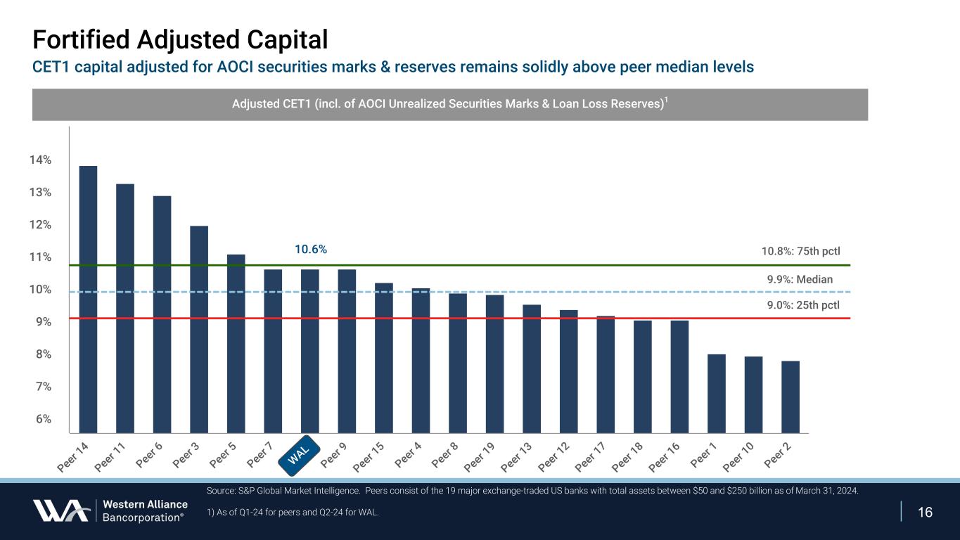 16 Source: S&P Global Market Intelligence. Peers consist of the 19 major exchange-traded US banks with total assets between $50 and $250 billion as of March 31, 2024. 1) As of Q1-24 for peers and Q2-24 for WAL. Peer 1 4 Peer 1 1 Peer 6 Peer 3 Peer 5 Peer 7 WAL Peer 9 Peer 1 5 Peer 4 Peer 8 Peer 1 9 Peer 1 3 Peer 1 2 Peer 1 7 Peer 1 8 Peer 1 6 Peer 1 Peer 1 0 Peer 2 12% 180% 11% 10% 9% 8% 7% 6% 13% 9.9%: Median 14% 10.8%: 75th pctl 9.0%: 25th pctl Adjusted CET1 (incl. of AOCI Unrealized Securities Marks & Loan Loss Reserves)1 Fortified Adjusted Capital CET1 capital adjusted for AOCI securities marks & reserves remains solidly above peer median levels 10.6% WAL