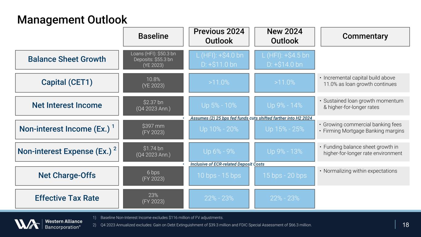 17 519% 595% 73% 125% 2013 2014 2015 2016 2017 2018 2019 2020 2021 2022 2023 MRQ 0x 1x 2x 3x 4x 5x 6x 7x Tangible Book Value per Share1 • TBVPS increased $1.49 to $48.79 from organic earnings • Increased 3.2% quarter-over-quarter, non- annualized • Increased 13.2% year-over-year • 18.6% CAGR since year end 2013 • TBVPS has increased more than 7x that of peers • Quarterly common stock cash dividend of $0.37 per share 1) Refer to slide 2 for further discussion of Non-GAAP financial measures. 2) MRQ is Q2-24 for WAL and Q1-24 for peers. Note: Peers consist of the 19 major exchange-traded US banks with total assets between $50 and $250 billion as of March 31, 2024. S&P Global Market Intelligence. Q2 2024 Highlights Tangible Book Value Growth Long-Term Growth in TBV per Share1 WAL Peer Median with Dividends Added Back Peer Median WAL with Dividends Added Back 2