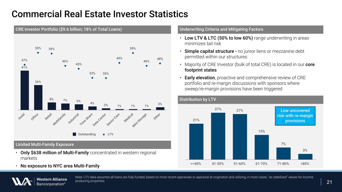 22 Commercial Real Estate Investor: Office Distribution by LTV Note: LTV data assumes all loans are fully funded; based on most recent appraisals or appraisal at origination and utilizing, in most cases, “as stabilized” values for income producing properties. 8% 14% 37% 28% 6% 7% <=40% 41-50% 51-60% 61-70% 71-80% >80% Key MSA Exposures $2.5 Billion; 26% of Total CRE Investor; 5% of Total Loans Underwriting Criteria and Mitigating Factors • Primarily shorter-term bridge loans for repositioning or redevelopment projects • Strong sponsorship from institutional equity and large regional and national developers • All direct relationships generated by WAL • Significant up-front cash equity required from sponsors • Conservative loan-to-cost underwriting • Average LTV < 55%; Average LTC ~62% • No junior debt / mezzanine • Largely suburban exposure in “Work From Home” MSAs • 2% in CBD, 10% in Midtown and 88% in Suburban MSAs • Focused on B+ properties accompanied by attractive amenities or those in core locations with appropriate business plans to reposition • Class A: 62%, Class B: 35%, Class C: 3% • 93% of Class B & C exposures have LTVs < 70% • Limited near-term maturity risk • 9% to mature in 2024, 40% to mature in 2025 and 51% to mature in 2026+ 88% 10% 2% Suburban Midtown CBD